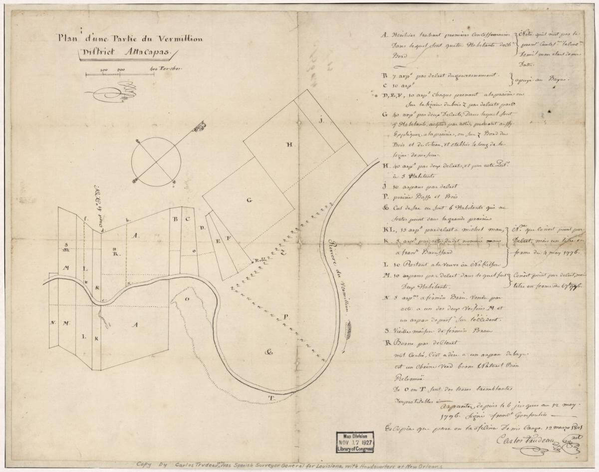 Plan d'une partie du Vermillion District Attacapas, [Attakapa region land grants], Louisiana, ca. 1795­–1816. Map by François Gonsoulin and Charles Laveau Trudeau. Courtesy of Library of Congress Geography and Map Division Washington, DC.