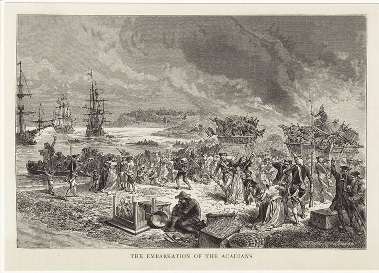 The Embarkation of the Acadians, 1881. Wood engraving by Émile Antoine Bayard and Henri Théophile Hildibrand. Courtesy of Art and Picture Collection, New York Public Library Digital Collections.
