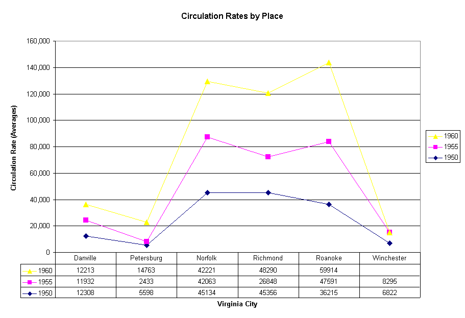 Big cities, especially Richmond, Roanoke, and Norfolk, witnessed the largest jumps in circulation during the fifties while the smaller Virginia southside and rural areas experienced nearly flat circulation rates over time. In each of these places, such as Danville, Winchester, and Petersburg, television stations that were unaffiliated with the newspapers began broadcasting in these years.