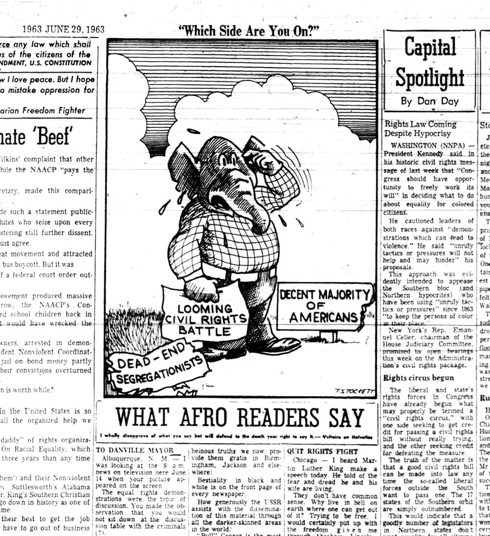 Richmond Afro-American, June 22, 1963. Richmond Afro-American cartoonist T. Stockett consistently poked fun at segregation and showed its inconsistency with American ideals of freedom and democracy. White newspaper cartoonists on the other hand, such as Fred Seibel or Reg Manning, focused on other issues, usually state political battles or the Cold War. African American papers depicted cartoons that constructed a story of resistance and confidence in change. One T. Stockett cartoon featured George Wallace hurling a "States Rights" rock at a huge oncoming tank, labeled "Federal Might." The caption asked, "Is there any doubt about who'll win this one?"