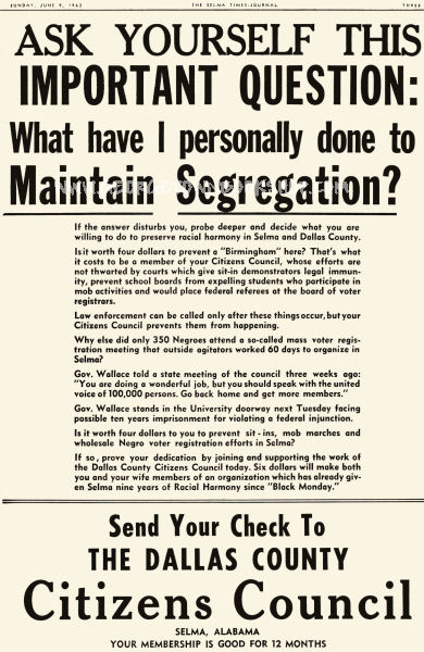 White Citizens Council recruitment flyer for Dallas County, Alabama, The Selma Times Journal, June 4, 1963. Image courtesy of Flickr user elycefeliz. Creative Commons license CC BY-NC-ND 2.0.