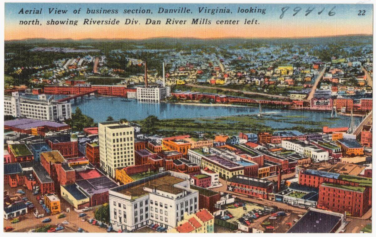 Aerial view of Business Section, Danville, Virginia, looking north, showing Riverside Div. Dan River Mills center left, 1930–1945. Courtesy of The Tichnor Brothers Collection, Boston Public Library. Creative Commons license CC BY 2.0.