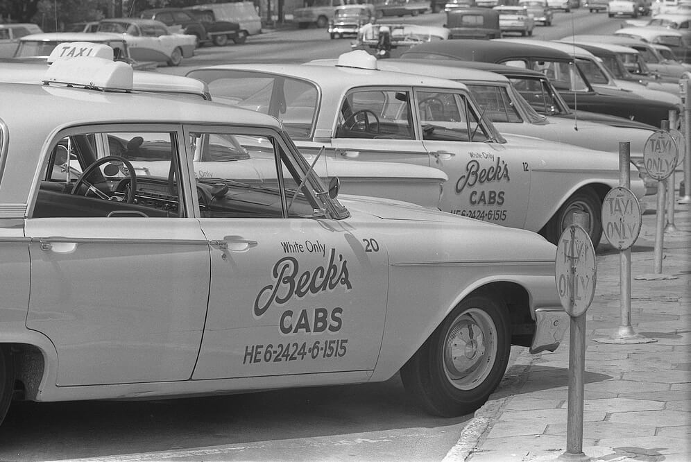 Taxi cabs with sign "White only, Beck's cabs" on side, Albany, Georgia, August 18, 1962. Photograph by Warren K. Leffler. Courtesy of the Library of Congress, Prints and Photographs Division, http://www.loc.gov/pictures/item/2012649184/.