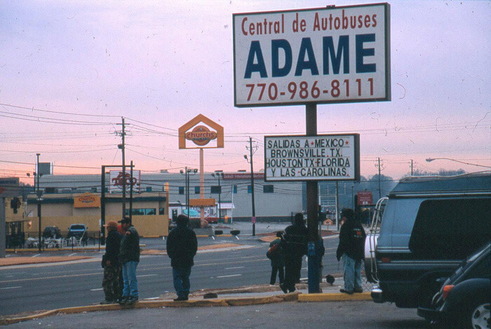 Adame Bus Station in Chamblee with routes from Atlanta to cities and towns in Mexico. Chamblee, Georgia. Photo by Mary Odem, 2001