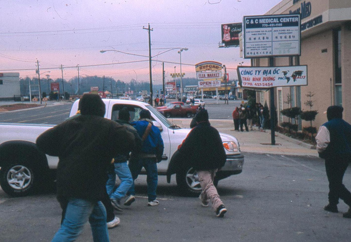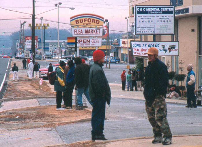 Day Laborers waiting for work on Buford Highway. Chamblee, Georgia. Photo by Mary Odem, 2001