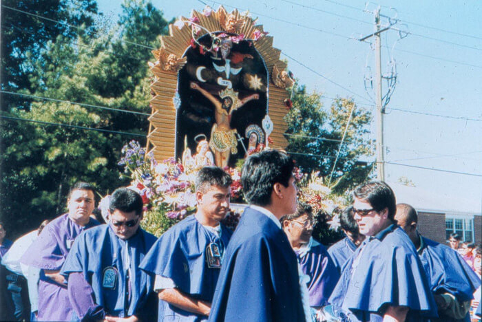 Procession for the Peruvian celebration of the feast day of El Señor de los Milagros. Doraville, Georgia. Photo by Mary Odem, 2000