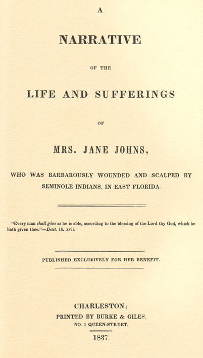 Anonymous.A Narrative of the Life and Sufferings of Mrs. Jane Johns, Who Was Barbarously Wounded and Scalped by Seminole Indians, in East Florida. Charleston, S. C.: Burke & Giles, 1837.