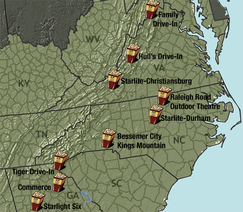Family Drive-In - Stephens City, Virginia Hull's Drive-In - Lexington, Virginia Starlite Drive-In - Christiansburg, Virginia Raleigh Road Outdoor Theatre - Henderson, North Carolina Starlite Drive-In - Durham, North Carolina Bessemer City Kings Mountain Drive-In - Bessemer City, North Carolina Tiger Drive-In - Tiger, Georgia Commerce Drive-In - Commerce, Georgia Starlight Six - Atlanta, Georgia Image Map
