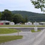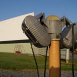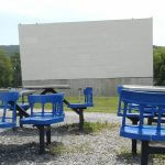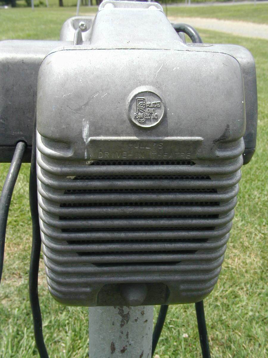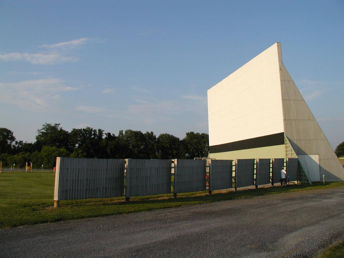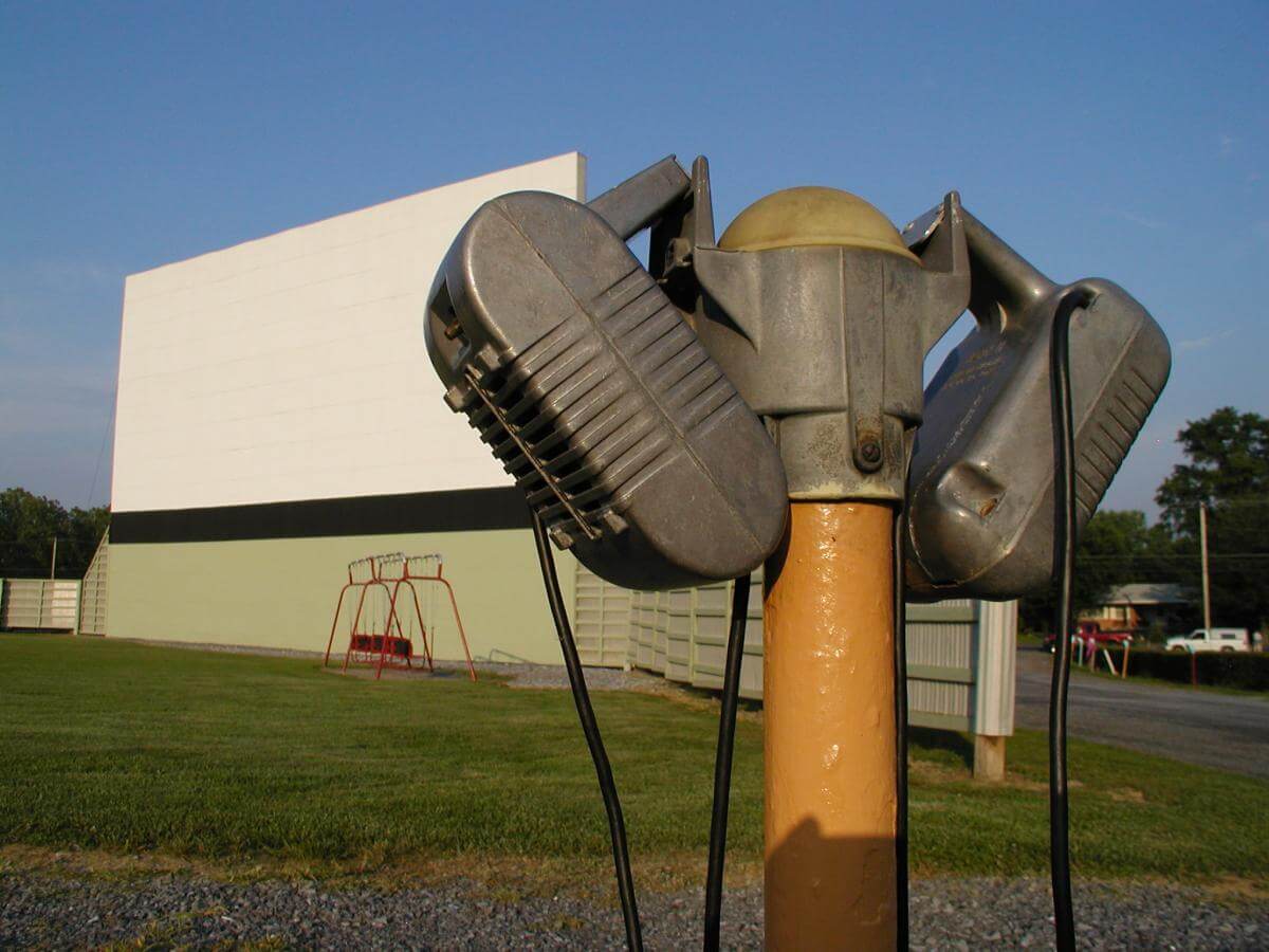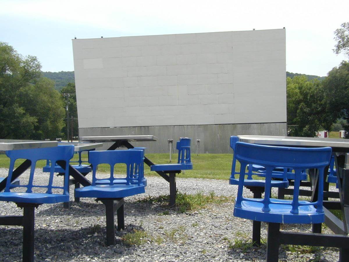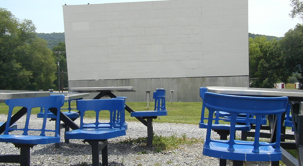Small and well-kept, Hull's Drive-In Theater is nestled in the rolling hills along US Route 11, just north of Lexington, Virginia. Vintage speakers decorate the gravel parking lot and mark parking spots for patrons. The speakers are functional, but audio is also transmitted by the theater's FM broadcast. Bright blue restaurant tables adjoin the concession stand. A black-and-white flyer near the snack counter promotes the 75th Anniversary of Drive-Ins by offering seventy-five cent popcorn. Hull's large, white movie screen is supported by metal framework in the middle and by wooden telephone poles on the sides, which suggests that the screen may have been enlarged at some point in the past.