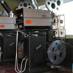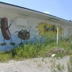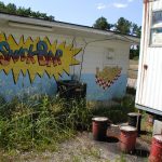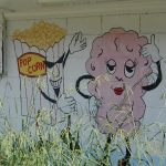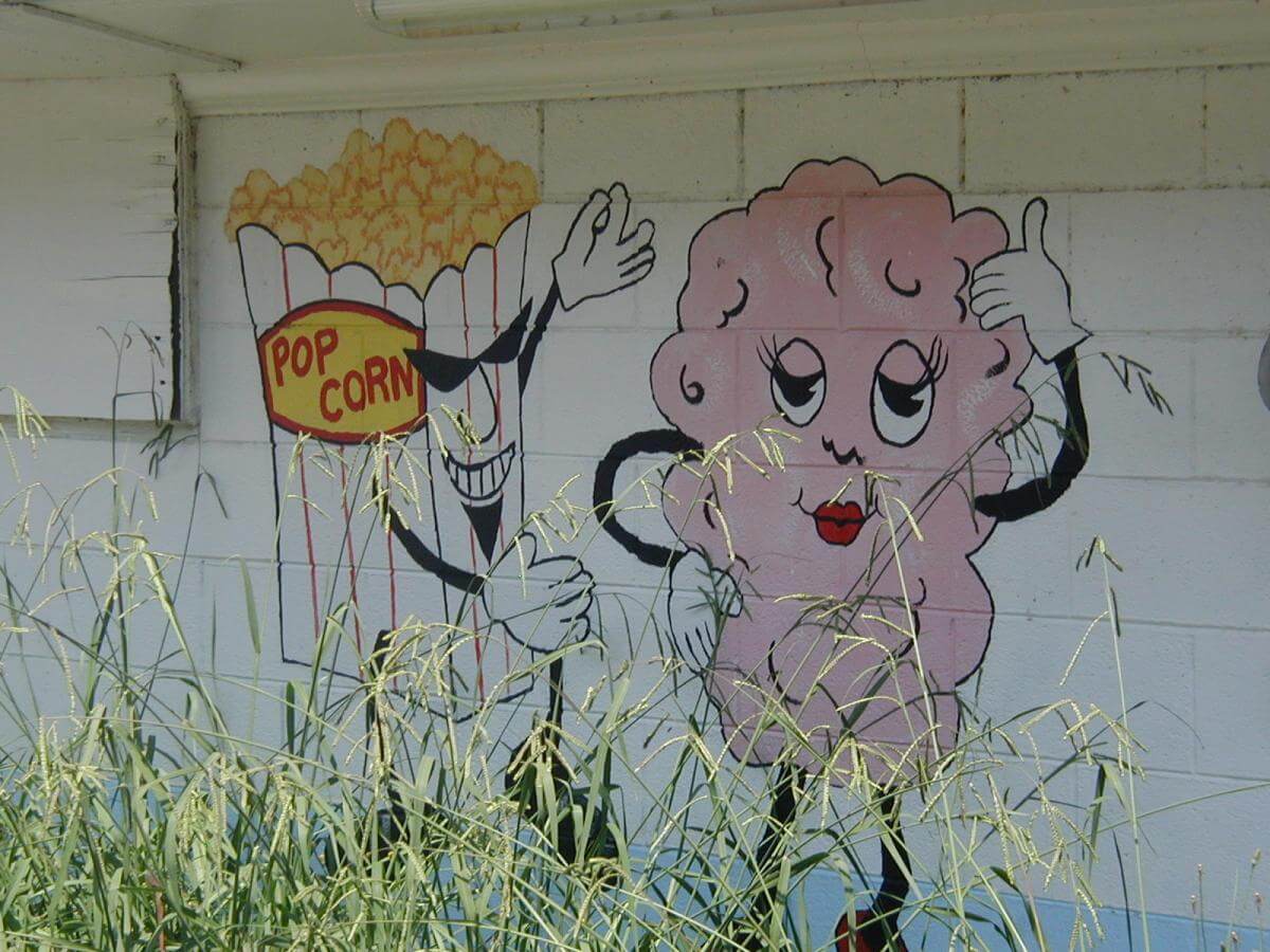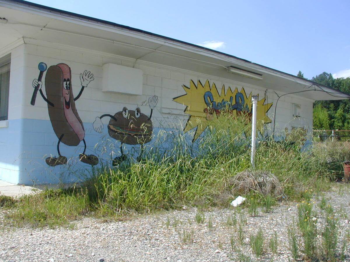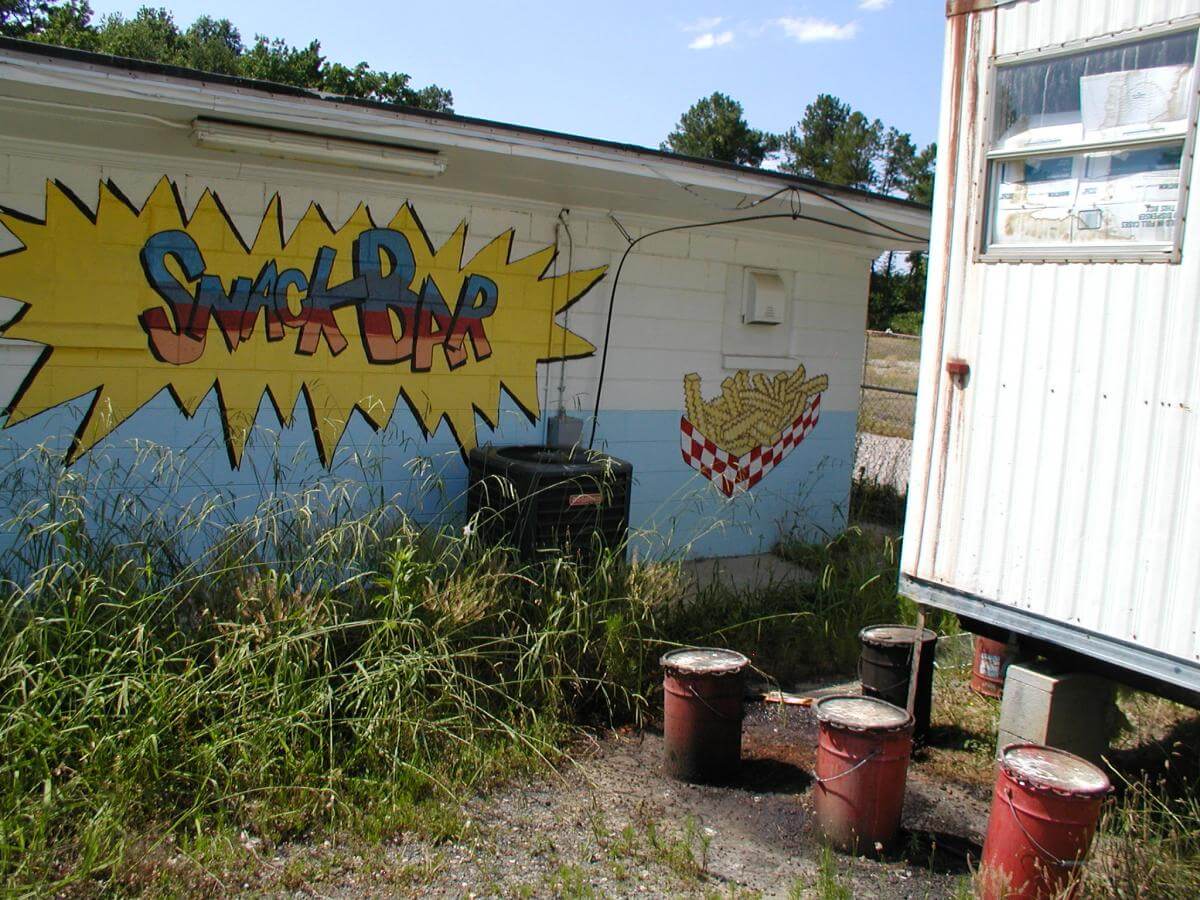 The Starlite Drive-In stands in a residential area northeast of Durham, less than half a mile from Interstate 85. Grass and weeds slowly reclaim the sandy gravel parking area; a fifteen-foot-high mound of used tires is heaped against the back fence. Speaker poles and junction boxes remain, but the speakers are long gone. Brightly-painted murals of anthropomorphized concession treats — dancing hot dogs and burgers, a lecherous popcorn bucket, and smiling condiments — decorate the concrete-block snackbar and projection booth. The paint appears fresh, but tall weeds and boarded windows suggest no activity. Inside, clutters of spare mechanical parts, video rental boxes, sleeves of Coca-Cola cups, and film canisters hint at an abrupt abandonment. Even much of the projector remains.