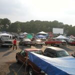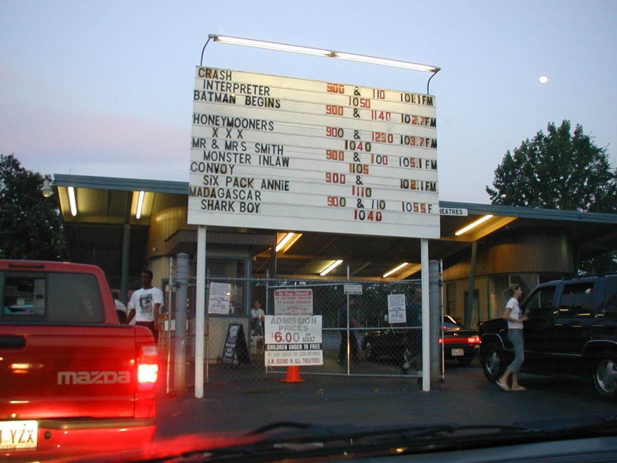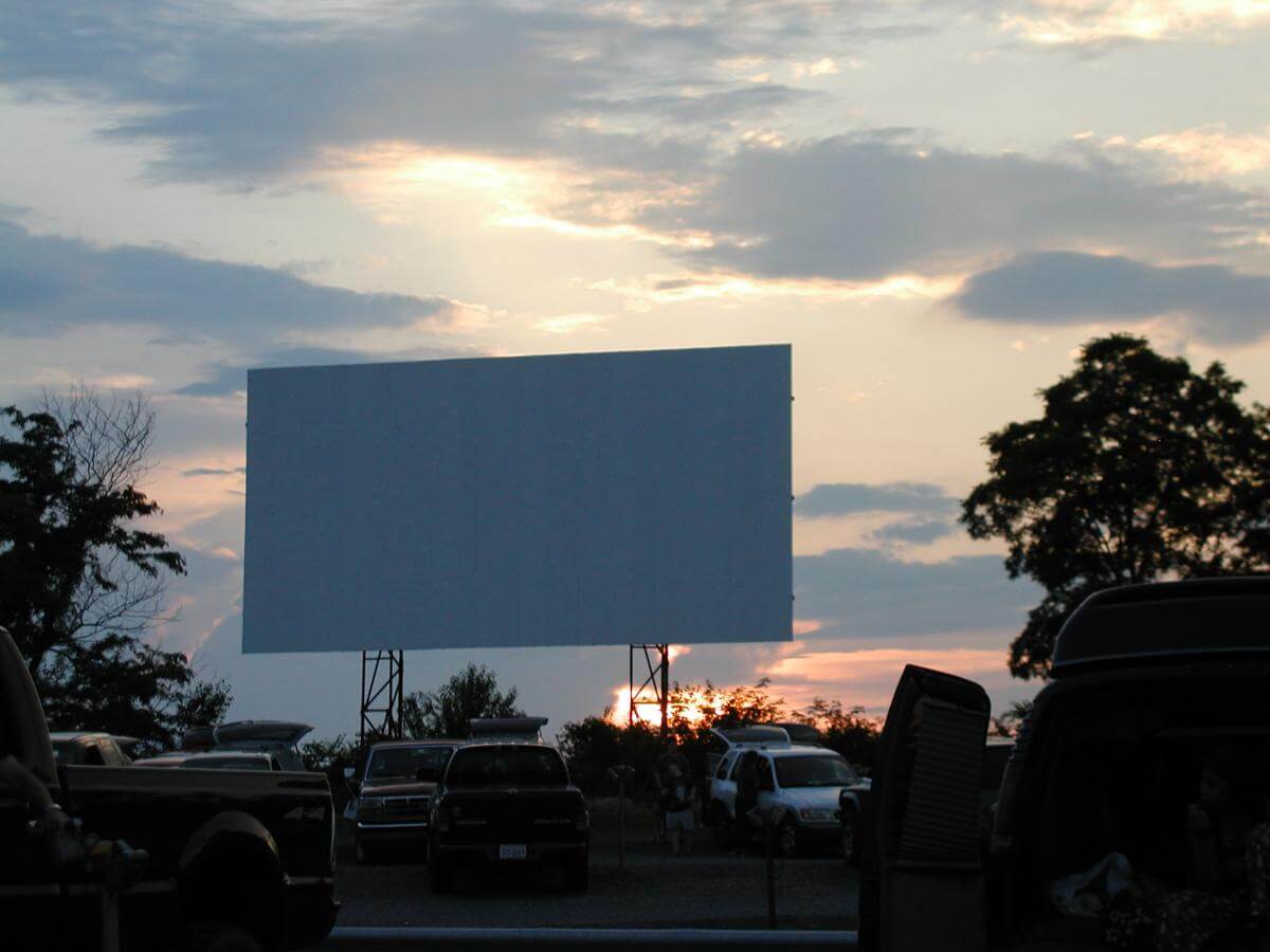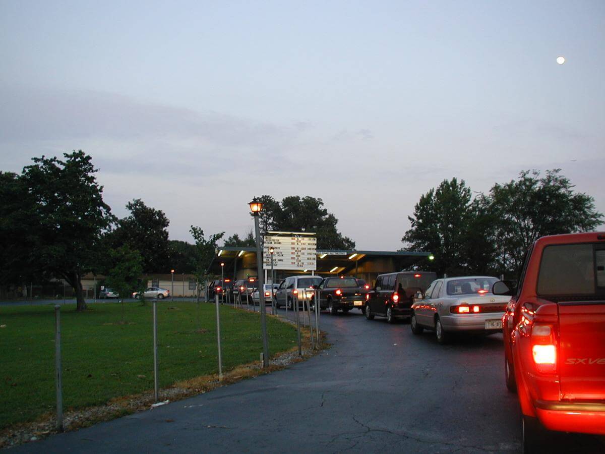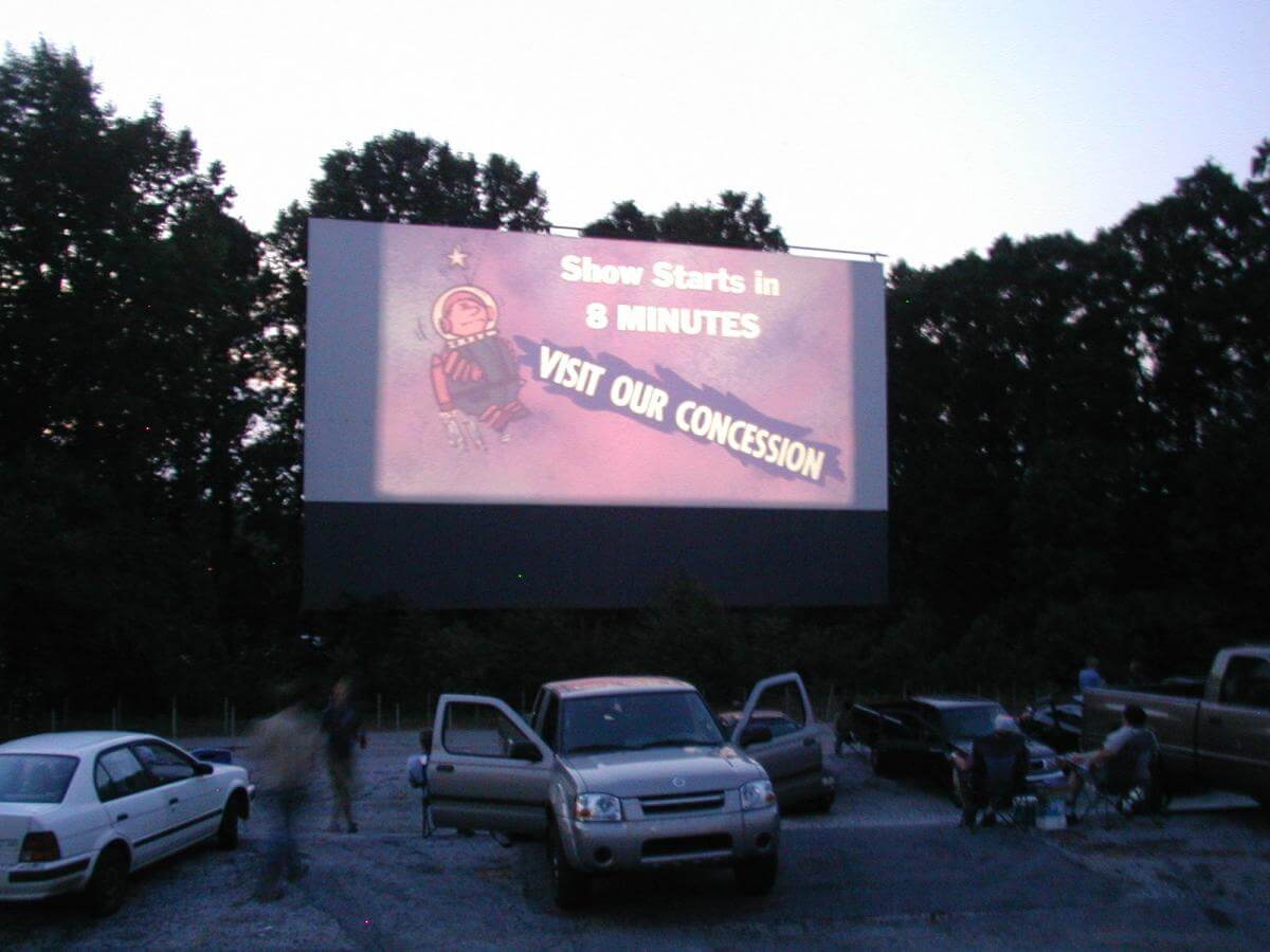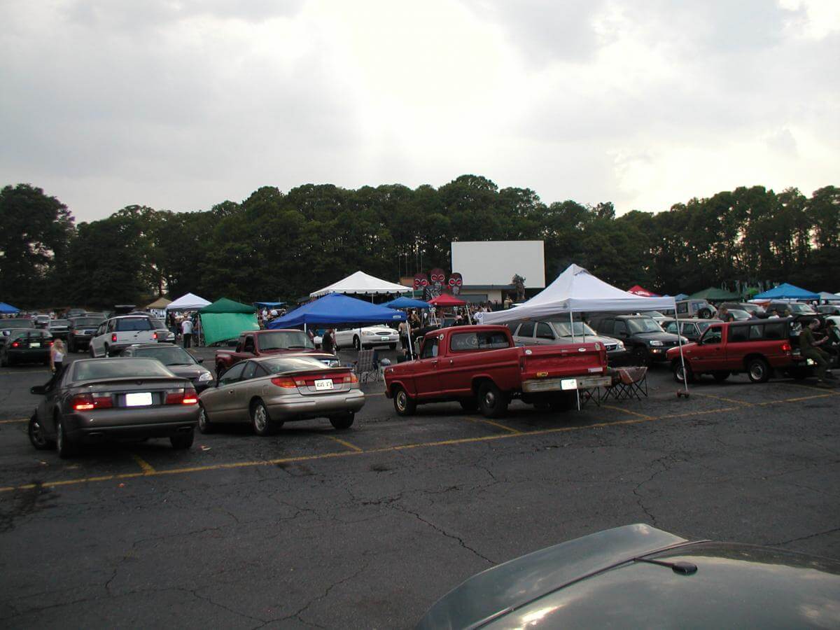 On hazy weekend evenings in the Atlanta summer, groups of twenty- and thirty-somethings gather around portable grills and mingle with carloads of young families, middle-aged couples, retirees, and teenagers. Just before the double-feature starts around nine o’clock, lines to the indoor restrooms stretch past the snack bar and visitors trot to the concession counter for nachos, fountain drinks, hotdogs, and large bags of popcorn. Many patrons tune their car radios to their screen's FM channel and roll their windows down to hear the car speakers as they sit in folding chairs in front of their vehicles. Clunky portable radios and ancient boomboxes sometimes stand in the middle of clustered viewers. As the main feature plays, theater attendants in golf carts survey the lot, often illuminated by the headlights of latecomers searching for open spaces. Headlights flit around the lot, then fade as the credits roll.
