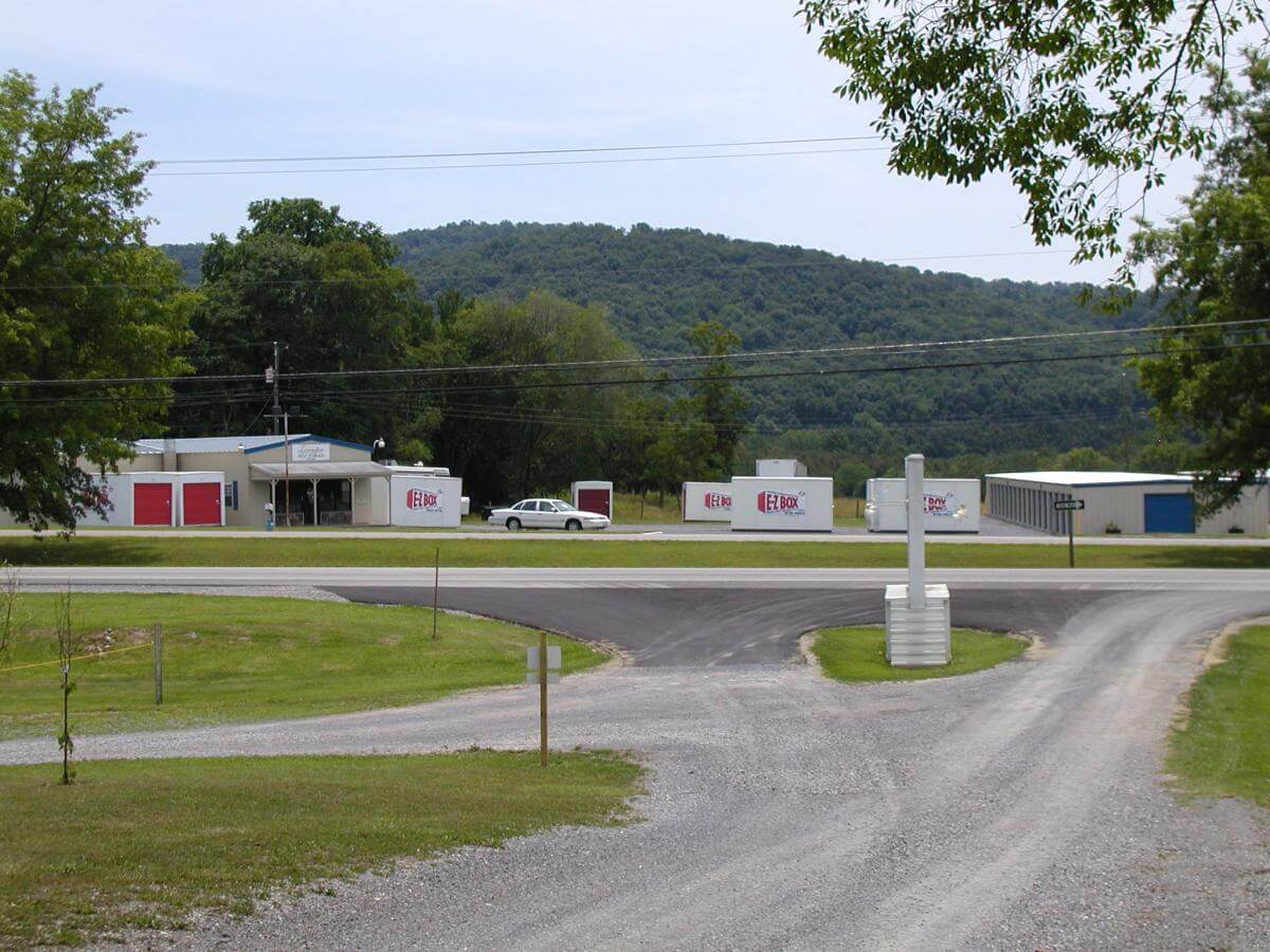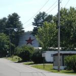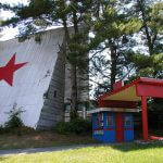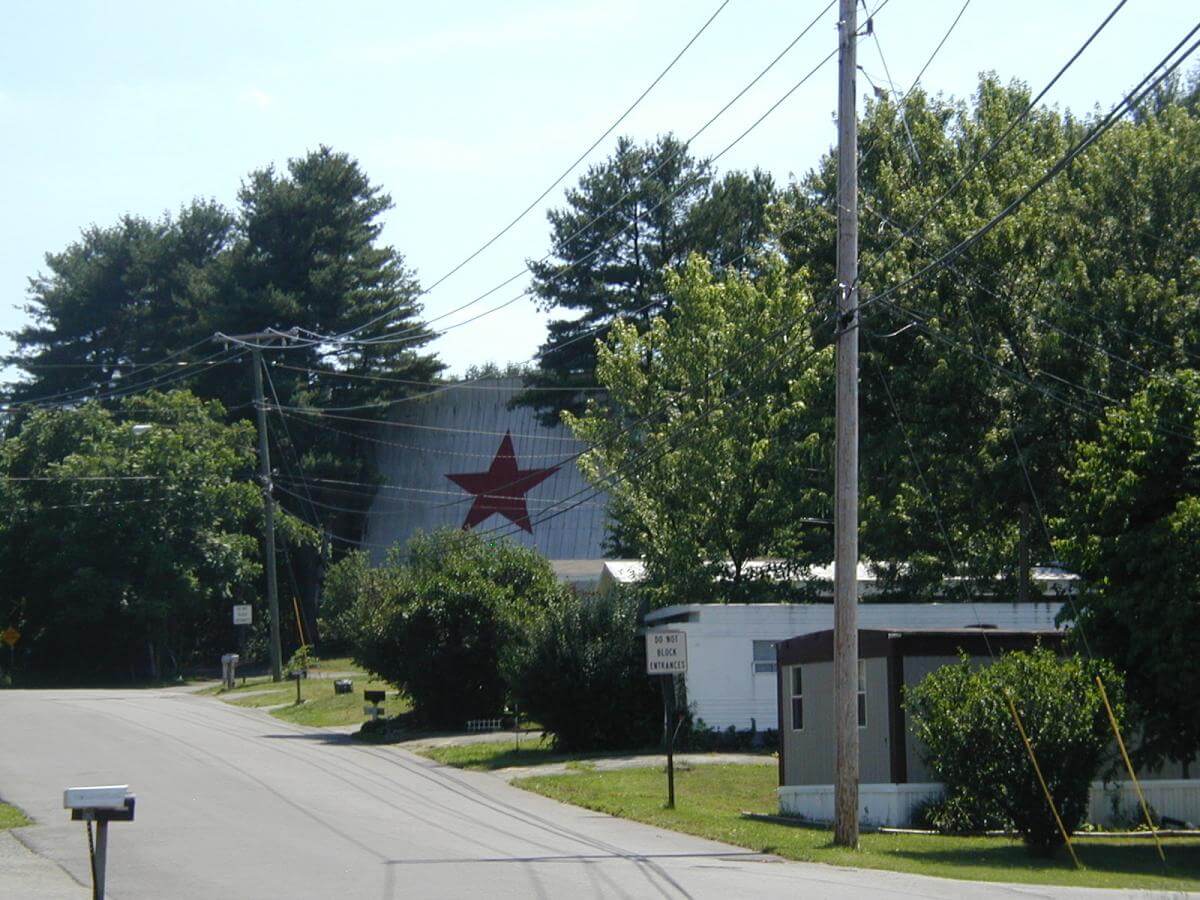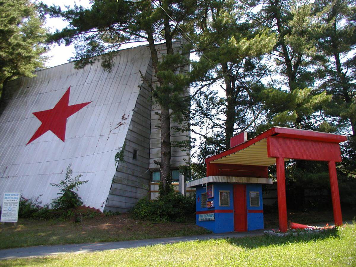 The Starlite Drive-In is located in the southwestern Virginia town of Christiansburg, along the New River Valley on the western side of the Blue Ridge Mountains. Neon lights illuminate the blue-and-red ticket booth and the matching building that houses the projector, restrooms, and snackbar. The Starlite's bright colors contrast with the drive-in's residential surroundings. Two beige ranch houses sit behind the last row of parking. The screen abuts the Starlite Mobile Home Park; the large red star painted on its metal back peeks through overgrown trees at the end of a neighborhood street.