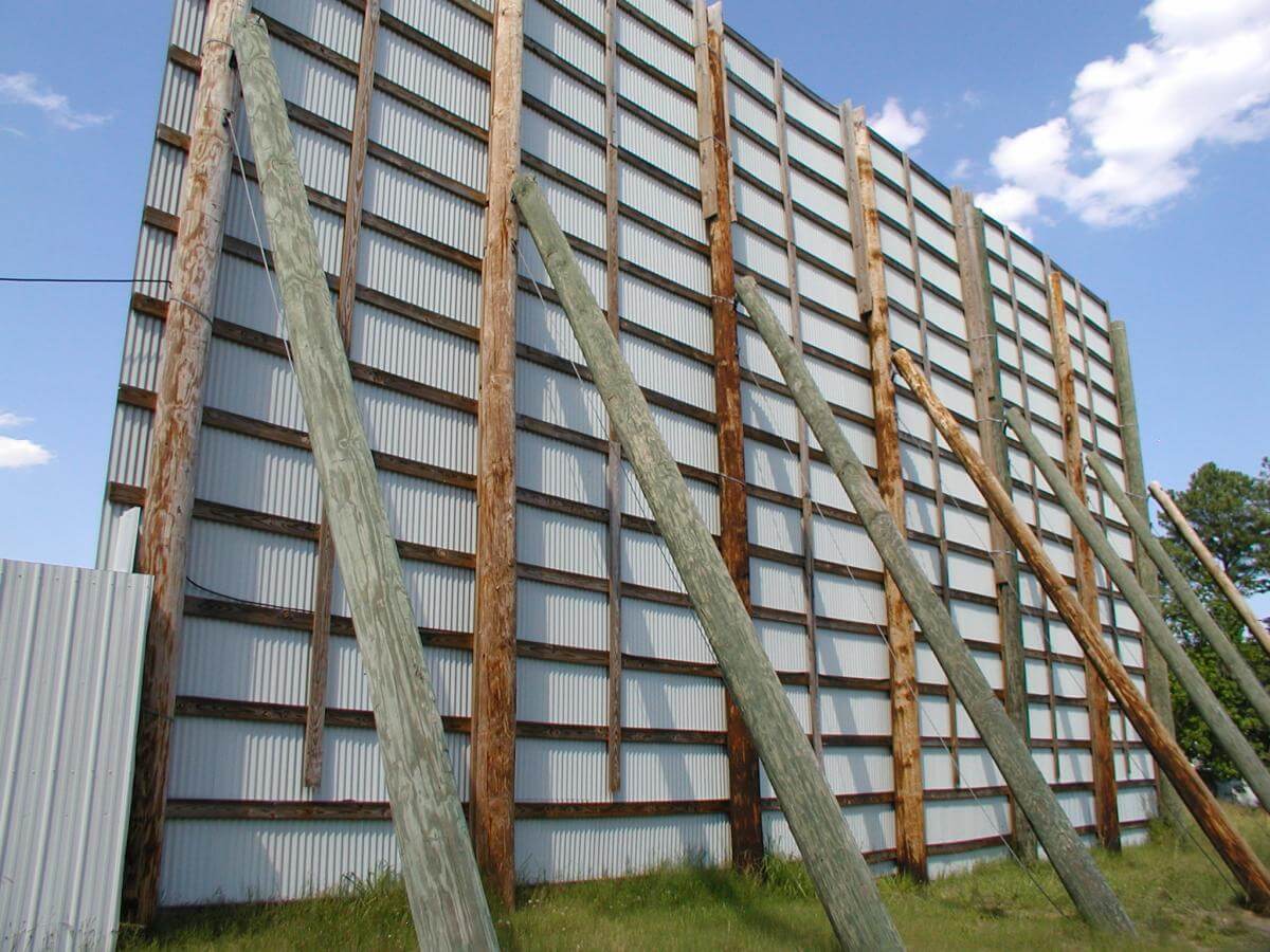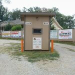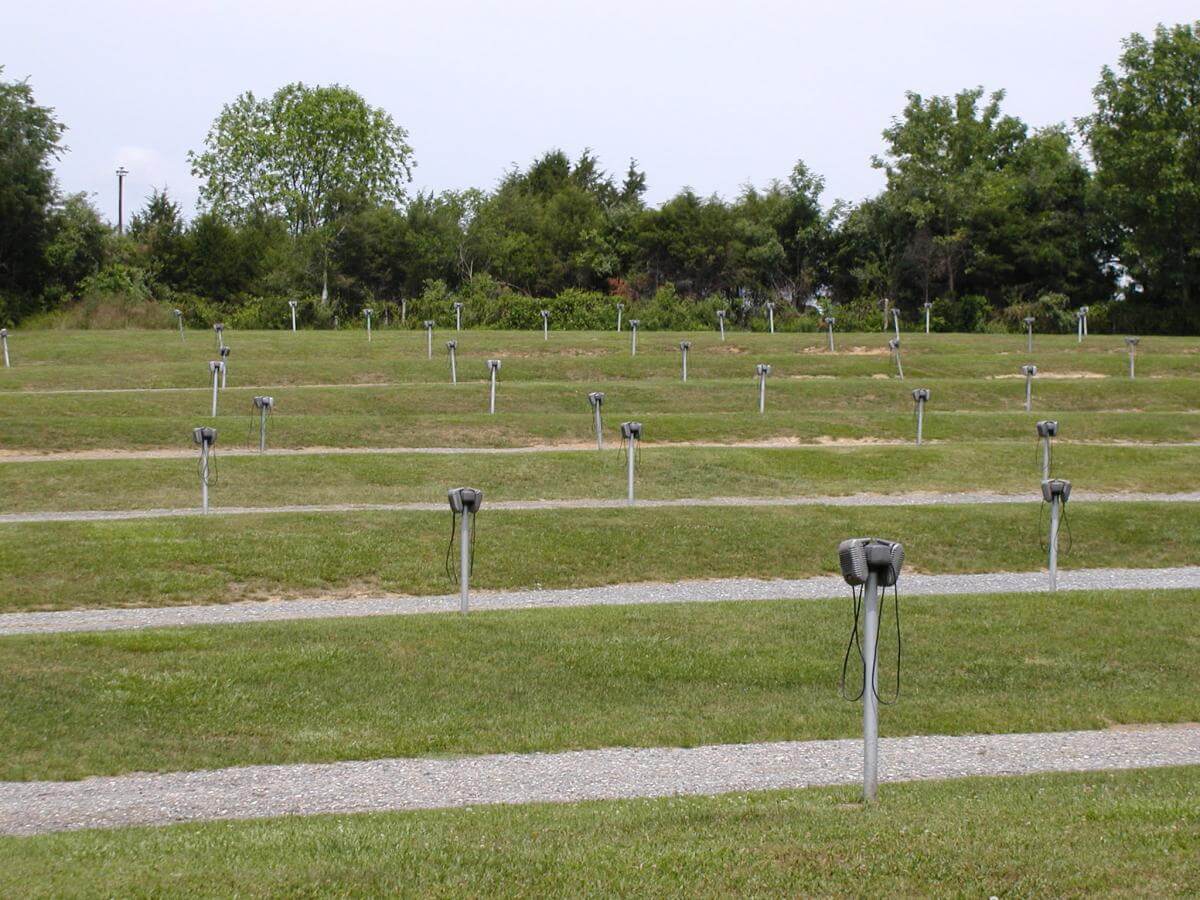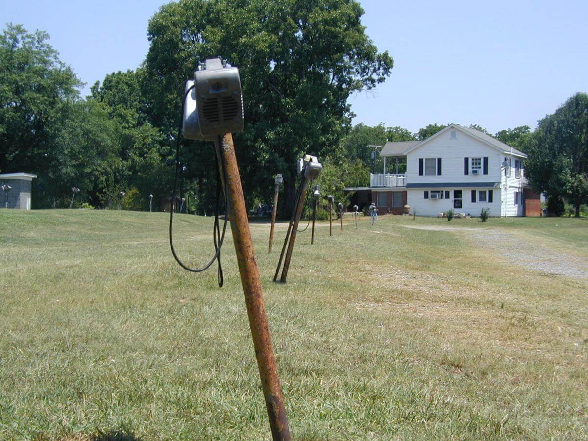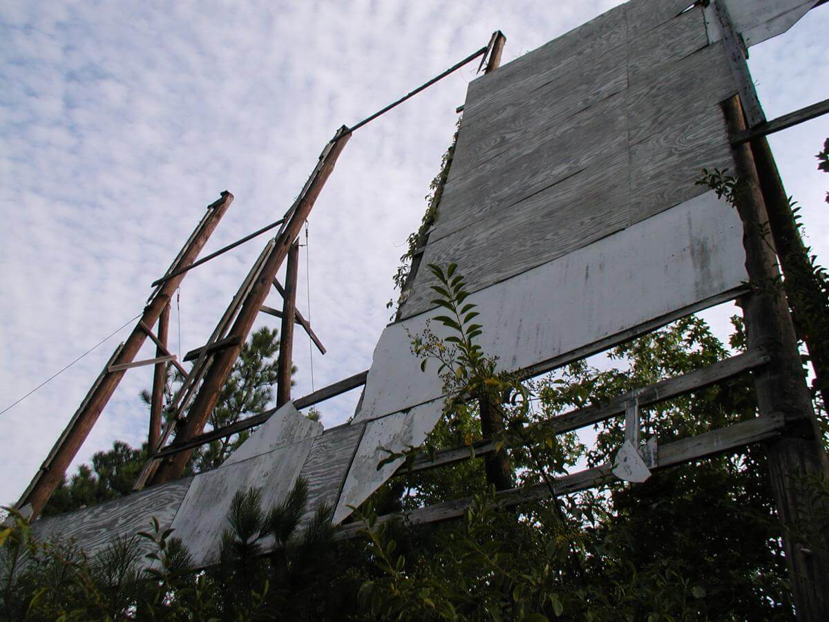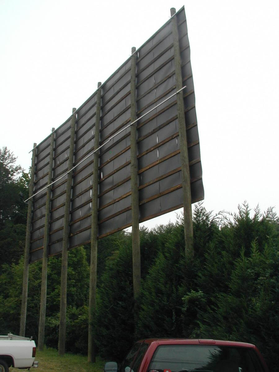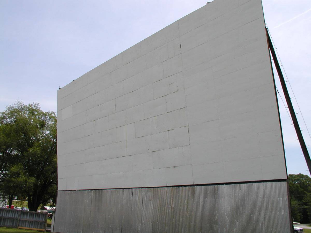 There are four active drive-in theaters within a forty-mile radius of Charlotte, North Carolina: the Belmont, the Sunset, the Bessemer City Kings Mountain to the south, and the Badin Road to the east. Located on North Carolina State Route 161 about two miles north of Interstate 85, the Bessemer City Kings Mountain Drive-In is in poor physical condition. Paint peels from the ticket booth, and one side of the roof seems haphazardly repaired. A "7" made from black electrical tape announces the price of admission has been reduced by a dollar per car — this is the only drive-in we visited that charged by the carload. There is no playground in this austere space. Strips of parched grass run between gray gravel driveways. Heavily rusted speaker poles tilt awkwardly over mowed grass. The difficulty in maintaining functional drive-in speakers was also apparent — speaker connections were patched with electrical tape, and the speakers themselves often bear the names of other drive-in theaters. The screen itself, composed of white rectangular panels, had begun to warp from weather exposure. Hot summer sun filtered through cracks between the panels.