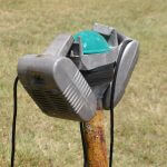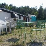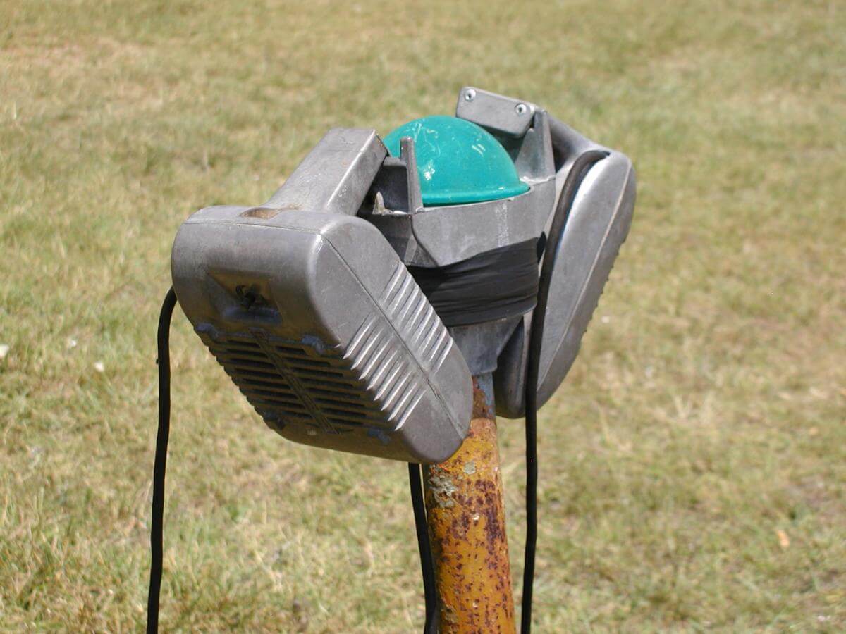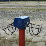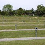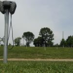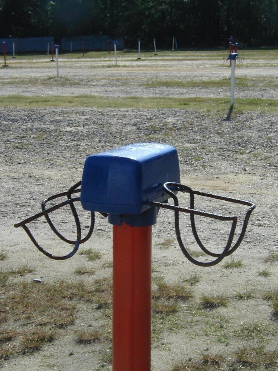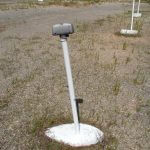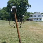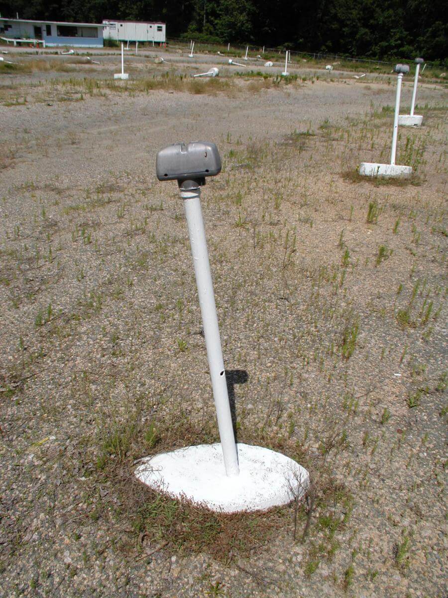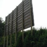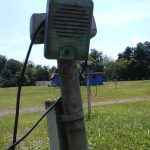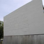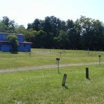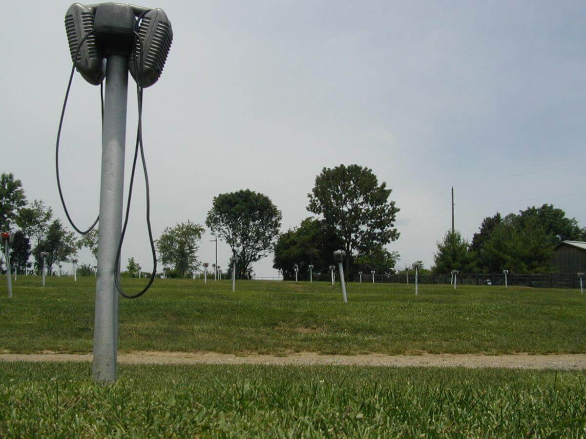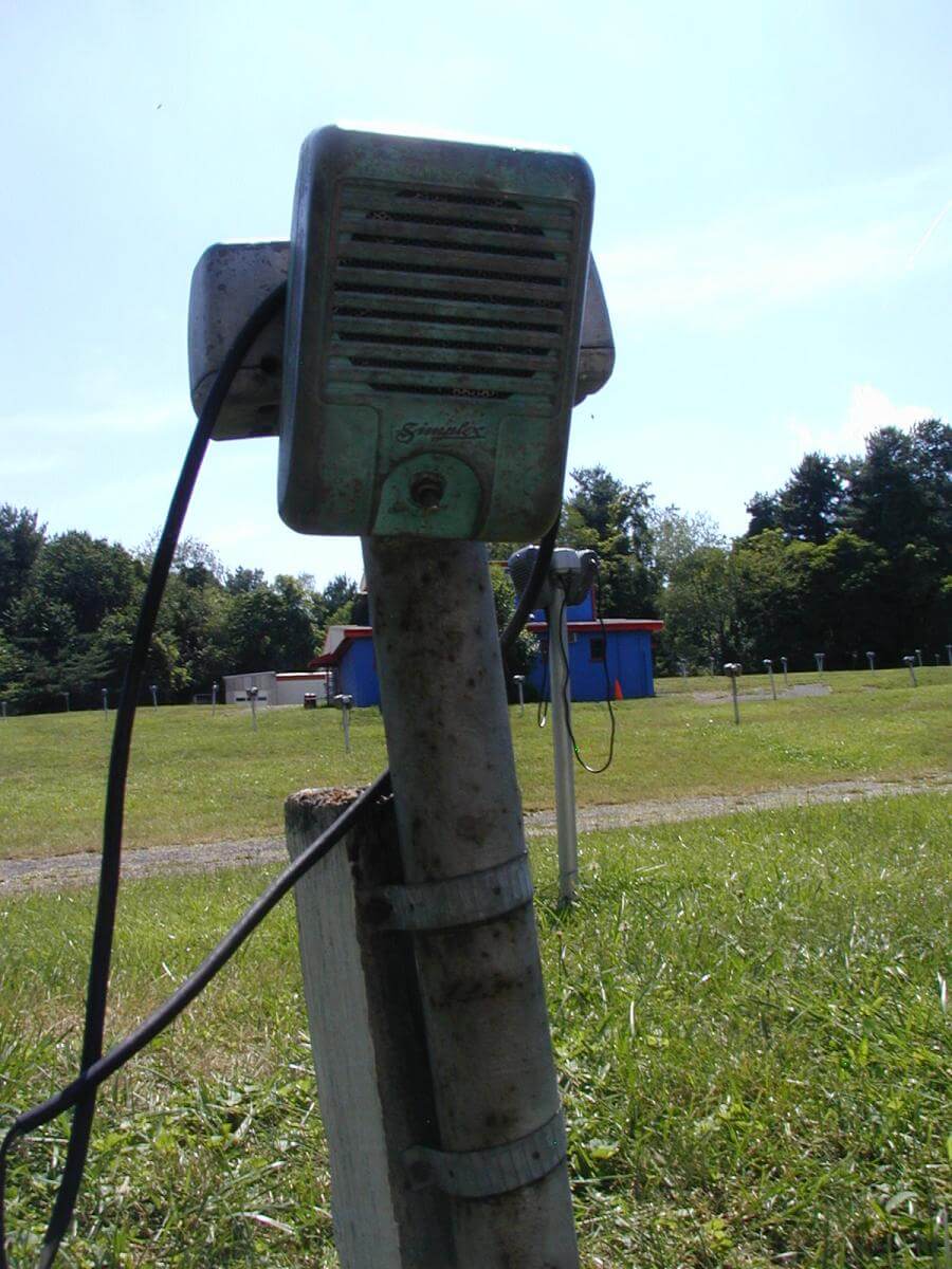 There are four active drive-in theaters within a forty-mile radius of Charlotte, North Carolina: the Belmont, the Sunset, the Bessemer City Kings Mountain to the south, and the Badin Road to the east. Located on North Carolina State Route 161 about two miles north of Interstate 85, the Bessemer City Kings Mountain Drive-In is in poor physical condition. Paint peels from the ticket booth, and one side of the roof seems haphazardly repaired. A "7" made from black electrical tape announces the price of admission has been reduced by a dollar per car — this is the only drive-in we visited that charged by the carload. There is no playground in this austere space. Strips of parched grass run between gray gravel driveways. Heavily rusted speaker poles tilt awkwardly over mowed grass. The difficulty in maintaining functional drive-in speakers was also apparent — speaker connections were patched with electrical tape, and the speakers themselves often bear the names of other drive-in theaters. The screen itself, composed of white rectangular panels, had begun to warp from weather exposure. Hot summer sun filtered through cracks between the panels.