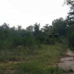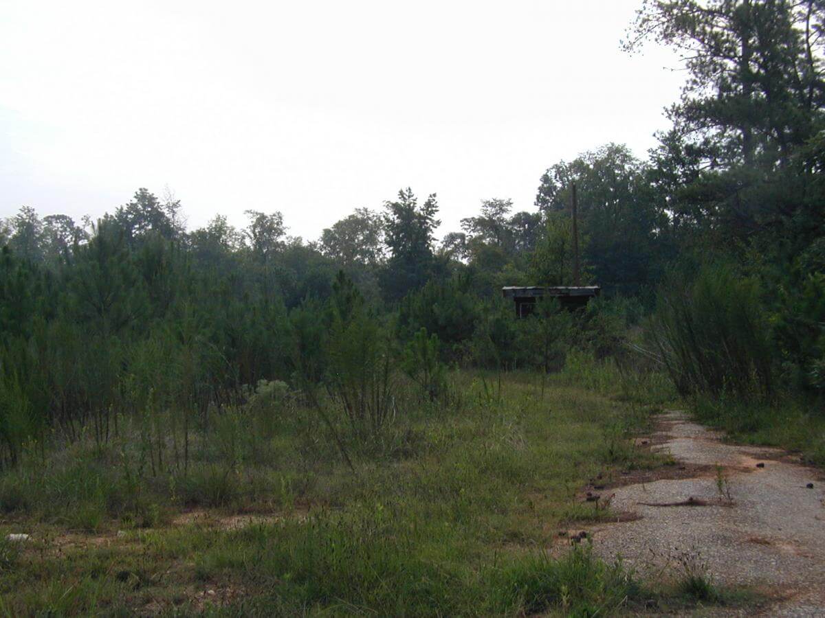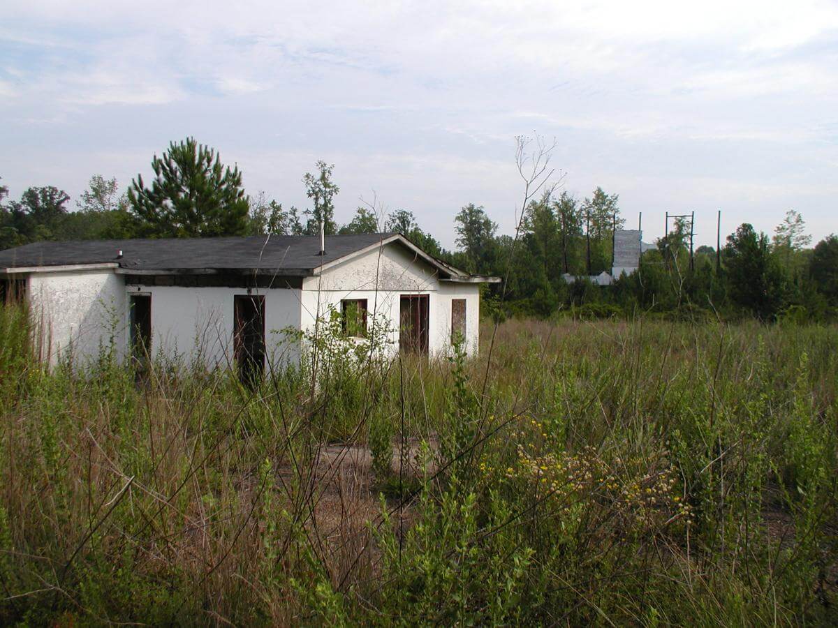Two parallel driveways leading away from US Highway 441, just south of Commerce, Georgia, offer the only indication that the Commerce Drive-In once stood over the crest of the hill. A "for sale" sign stands on a rise to the left; a cable stretched across the entrance bars entry Paved asphalt and cropped grass give way to an undergrowth of tall weeds, briars, and young pines. Broken pavement covered with pine straw and weeds curves around the ticket booth. The booth's white paint appears crisp, but the red trim is peeling, and no glass remains in the windows. Vines, thorns, and large bushes block approach to the booth on three sides. Beyond, the brush clears to reveal the old parking lot, concession stand, and, at the far edge of the field, the remnants of a screen.