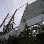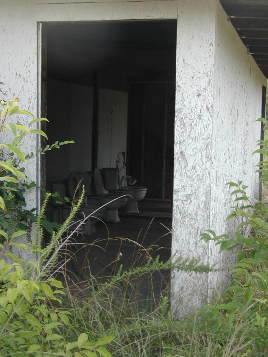 After nearly fifty years in operation, the Commerce Drive-In closed in 2001. Once, it sported three screens, but now only a few forlorn sections of plywood cling to the screen's skeletal wooden supports.36Gardner Linn, "Drive in, put it in park," The Red and Black [University of Georgia], 25 January 2001, Variety. http://www.redandblack.com/variety/drive-in-put-it-in-park/article_f83376cb-7993-520c-80ab-1110098fe456.html]. For a more detailed discussion of the layout of the Commerce Drive-In, see Lonnee, 107-115. Scrub grass and weeds cover the paved gravel lot. A few rusted speaker poles sprout here and there, but most are gone. The doors and windows of the concession stand yawn open. Inside, little remains except more peeling paint, collapsed ceiling tiles, and a row of three porcelain toilets.