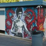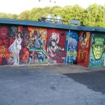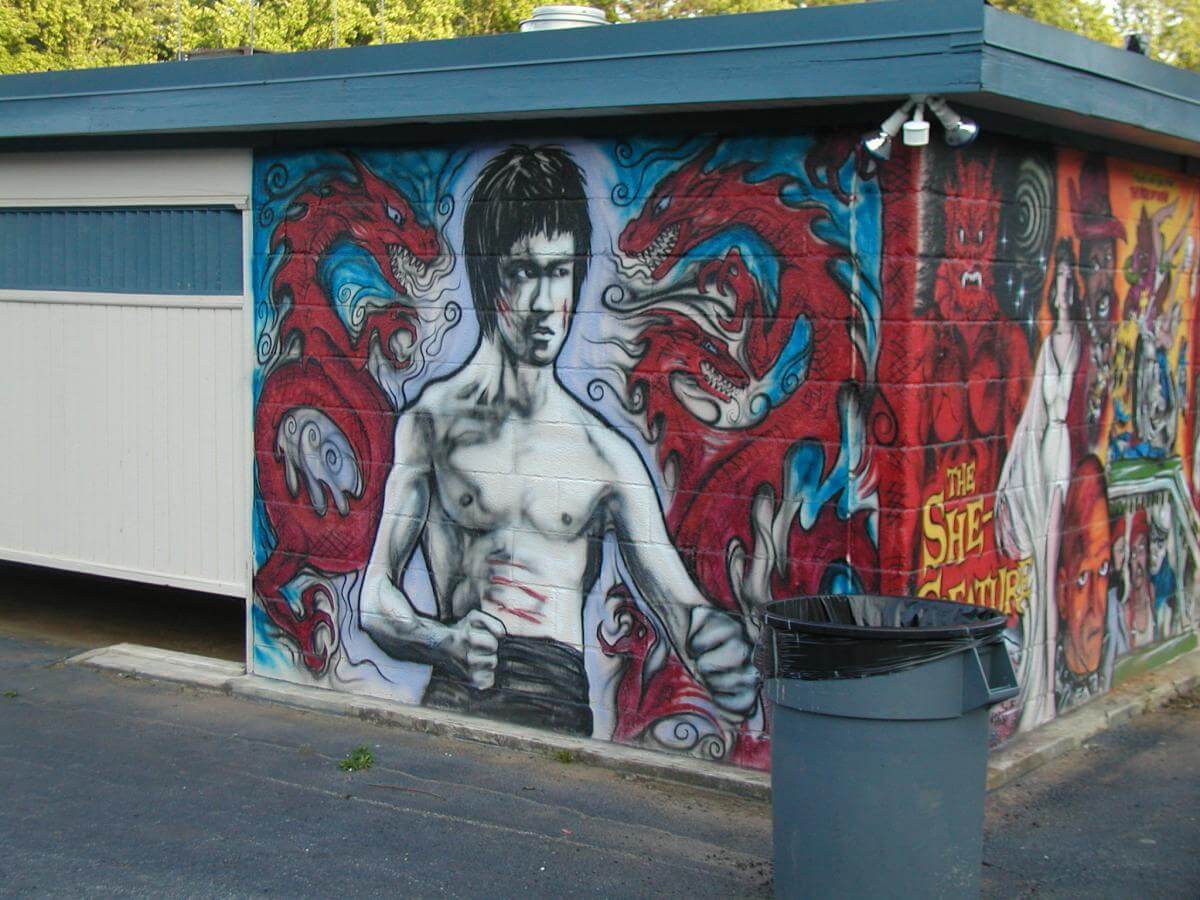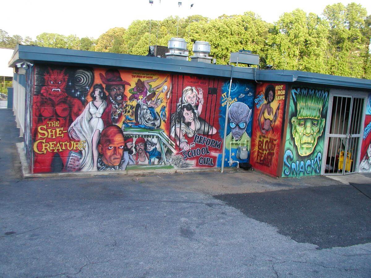 The Starlight was originally a single-screen theater when the Georgia Theater Company opened it in 1947. In 1956, the Georgia Theater Company added a second screen, and the drive-in's name was changed to the Starlight Twin to reflect the expansion. Another four screens were added in 1983, so that the Drive-in could compete with multiplexing indoor theaters.40Lonnee, 122-124. The Starlight Six property is divided into two large, asphalt lots, each with three screens, a snack bar, patio area, and separate projection booth. The three screens on the lower level have a greater capacity than the upper lot, and special events like the annual Drive Invasion, Rock and Roll Monster Bash, and Downhill Challenge are usually held there. The lower level’s snack bar features vivid murals of Bruce Lee, Rudy Ray Moore as Dolemite, Cheech and Chong, and Robby the Robot. Unlike most of the other drive-ins featured in this essay, there are no speakers and poles at the Starlight Six; audio is transmitted exclusively through patrons' FM radios.