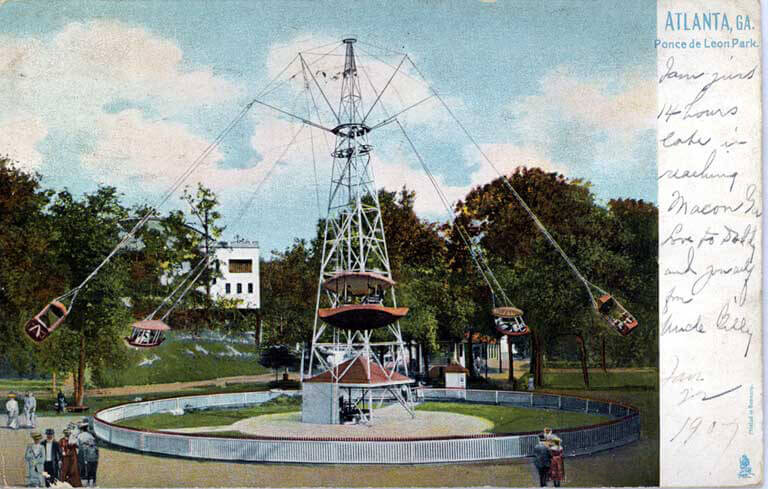 This essay explores Ponce de Leon Park, a popular turn-of-the-last-century amusement park two miles east of Atlanta, through postcards, photographs, video, and historical analysis. Now long gone, the park once served as a gathering place for weekend picnics, concerts, performances, and rides, and served as a microcosm for an emerging modern southern city with evolving social relations. The electric lights and mechanized rides on display at Ponce de Leon Park (pronounced "pän(t)-s di lE'än") offered Georgians a playful glimpse of new technology, which developed in step with the growing metropolitan area that surrounded it.While Atlanta’s first baseball stadium eventually rose on the site of the park, this essay explores transportation, technology, and social interactions at Ponce de Leon Park from 1870–1920—a period of electrification, modernization, and the rise of Jim Crow.