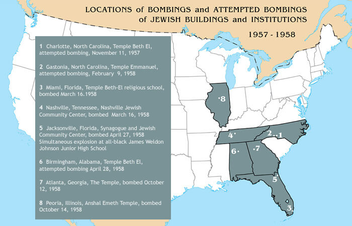 The Temple bombing was only one in a series of terrorist strikes on Jewish institutions by the "Confederate Underground." This band of fanatics had launched their first attack almost a year earlier. Their target was Temple Beth-El in Charlotte, North Carolina. On November 11, 1957, the caretaker discovered six sticks of dynamite concealed at the rear of the synagogue that although lit had failed to detonate. Four months later, on February 11, 1958, unidentified assailants planted thirty sticks of dynamite outside Temple Emanuel in the neighboring city of Gastonia. Once again, only a faulty fuse saved the synagogue.3Albert Vorspan to I. Cyrus Gordon, Commission on Social Action of Reform Judaism, March 3, 1958, "Attempted Dynamiting of North Carolina Synagogues," Small Collections, Jacob Rader Center of the American Jewish Archives, Cincinnati, Ohio.