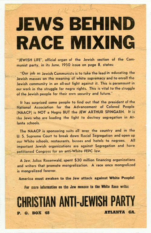 Christian Anti-Jewish Party flyer, circa 1950. Ralph McGill papers, Emory University Special Collections.