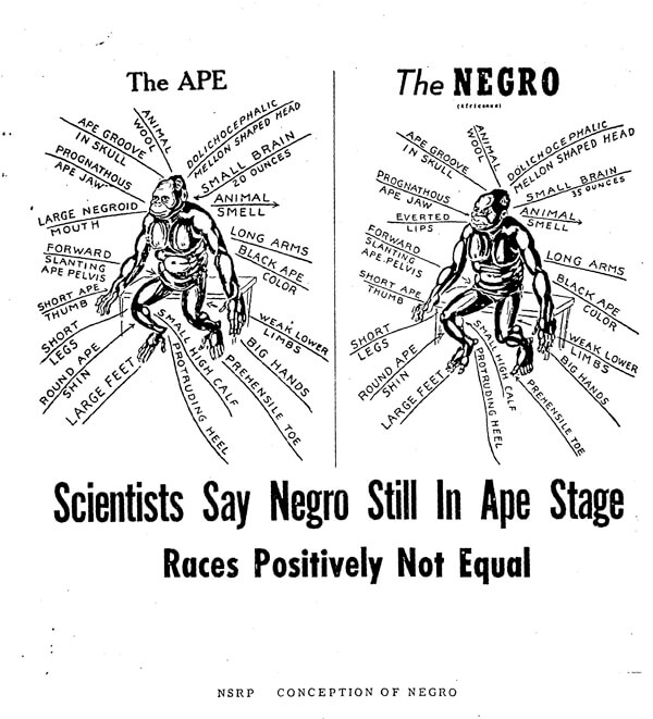 The NSRP emphasized the strength of its members' convictions by stating that African Americans were not simply a lesser race than were whites, but an entirely different species. "Scientists Say Negro Still in Ape Stage," asserted a leaflet published by the party, which included a diagrammatic comparison emphasizing their common features.17 "Scientists Say Negro Still in Ape Stage," Birmingham Police Department Surveillance Files, 1947–1980.