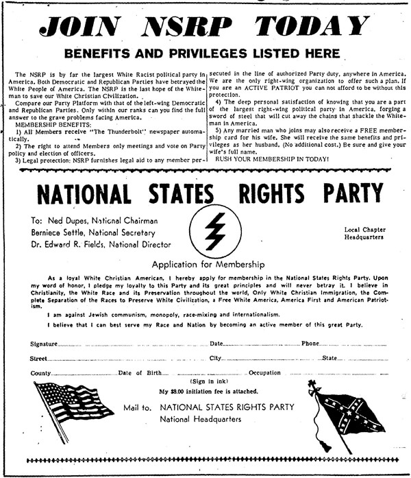 15. California Bureau of Criminal Identification and Investigation, Para-Military Organizations in California White Extremist Organizations, Part II: National States Rights PartyThe Present-Day Ku Klux Klan Movement, Report by the Committee on Un-American Activities, House of Representatives, 90th Cong. Ist Sess., December 11, 1967 (Washington, DC: US Government Printing Office, 1967), 13. (Sacramento, CA, 1965), NSRP-4; (unpublished monograph, May 1970), 5, National States Rights Party, Federal Bureau of Investigation File, Part II, ii, 2; NSRP membership application form, box 39, Jewish Community Relations Council of Minnesota Papers, Minnesota Historical Society, St. Paul; The Present-Day Ku Klux Klan Movement, Report by the Committee on Un-American Activities, House of Representatives, 90th Cong. Ist Sess., December 11, 1967 (Washington, DC: US Government Printing Office, 1967), 13.