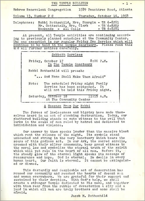 Excerpt from The Temple Bulletin, October 16, 1958. Courtesy of The Temple: Hebrew Benevolent Congregation of Atlanta.