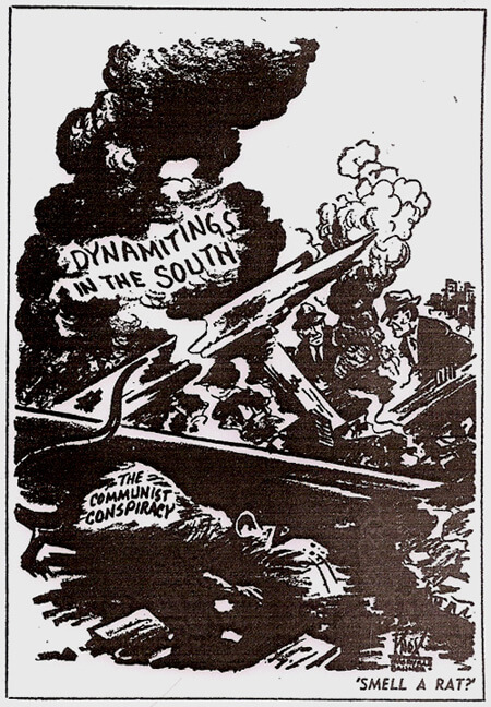 The Temple bombing forced an already defensive segregationist leadership further on the back foot. Massive resistance leaders moved swiftly to dissociate themselves from the bombing for fear that it would undermine their carefully cultivated image of respectability. The Citizens' Council published a cartoon in its newsletter disingenuously claiming that communist subversives had carried out the attack in order to taint all segregationists with a reputation for violent bigotry. The cartoon showed a rodent scampering from the wreckage of the bombing, underneath which were written the words "Smell a Rat?" Southern columnist David Lawrence similarly asserted that the bombing was a Soviet plot "to stir up antagonisms inside the United States and to portray America before the world as denying religious freedom."35The Citizens' Council, October 1958, 3; Evening Capital (Annapolis, MD), October 16, 1958.