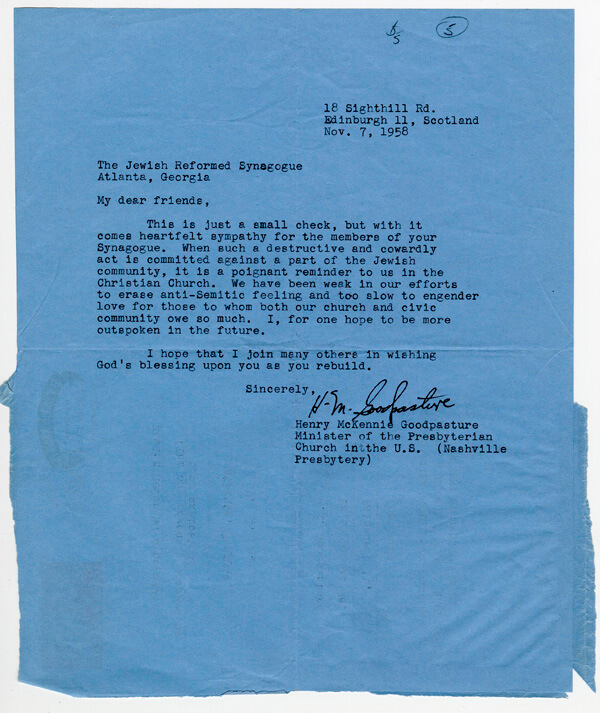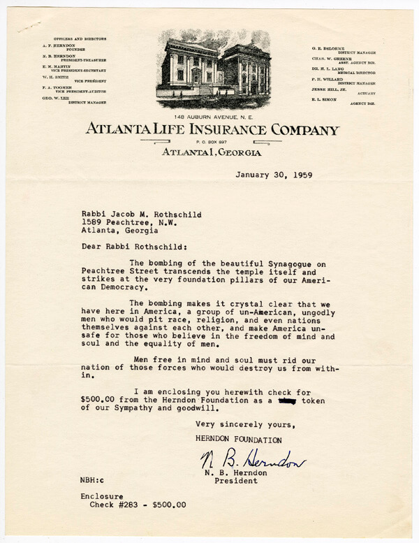 Public reaction to the Temple bombing nonetheless served in certain respects to aggravate racial tensions. African Americans reacted to the synagogue bombing with a certain degree of ambivalence. Black leaders expressed their sincerest sympathies, seeing the terrorist attack as evidence that southern resistance to desegregation bred violent hostility toward all minorities. As The Birmingham World, a black newspaper, asserted, "if such things are allowed to go unsolved when done against one minority group, the evil-doers become embolden to move after other unpopular groups." Ministers of the AME Church in Atlanta issued a resolution condemning the attack on the city's Reform Temple. Rabbi Rothschild also received a financial donation for repair work from an unexpected source. The black inmates of a local prison asked the chaplain to pass on a collective contribution to the building fund. Deeply moved, Rothschild wrote back that, "of all the gifts which we have received, this one certainly is one of the most meaningful and heart-warming."29Birmingham World, May 3, 1958; Atlanta Daily World, October 21, 1958; Jacob M. Rothschild to Chaplain Bill Allison, December 5, 1958, box 5, folder 3, Rothschild Papers.