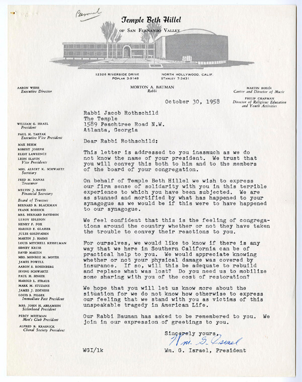 On the morning of Sunday, October 12, 1958, shortly after 3:30 a.m., an explosion ripped through the Reform Temple on Peachtree Street in Atlanta. Although no one was hurt, the blast, which woke people from their sleep several blocks away, caused almost $200,000 of damage.1Atlanta Constitution, October 13, 1958; New York Times, October 16, 1958. For a more substantial narrative of events, see Melissa Fay Greene, The Temple Bombing (Reading, MA: Addison-Wesley, 1996).