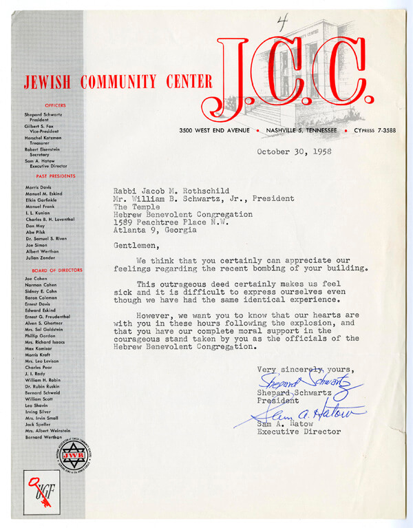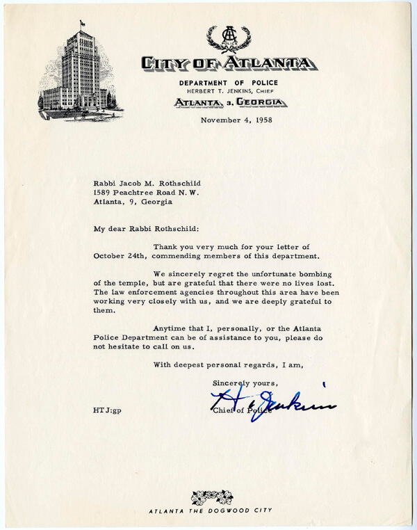 The Temple was a particular target because of the conspicuous leadership that its rabbi, Jacob M. Rothschild, had provided in support of black civil rights. Once asked by a representative from the Union of American Hebrew Congregations to write a report on his activities in the area of civil rights, Rabbi Rothschild replied, "whatever part I played in the Atlanta story was an extremely minor one." This was an unduly modest assertion. Through his outspoken support of integration, at a time when others chose to remain silent, Rothschild helped encourage a climate of tolerance and understanding between the races.7Jacob M. Rothschild to Balfour Brickner, October 12, 1961, box 5, folder 8, Rothschild Papers, 1933–1985, Manuscript, Archives, and Rare Book Library, Emory University, Atlanta.