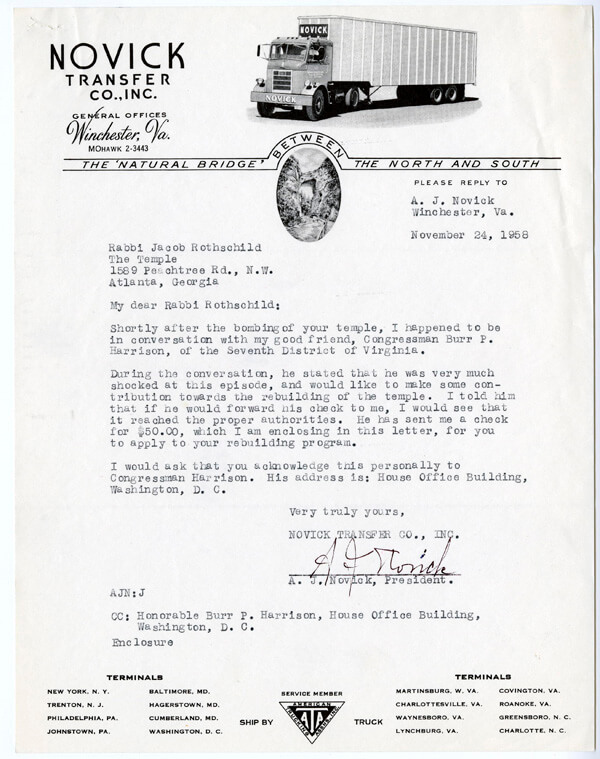 Alarmed at the potential impact that the bombing of the Reform Temple might have upon their city's image of being "too busy to hate," Atlantans inundated Rabbi Rothschild with words of remorse. Mayor Hartsfield blamed southern leaders whose outspoken resistance to the Supreme Court decision had, he alleged, led to a loss of respect for the law throughout the region: "Whether they like it or not, every rabble-raising politician is the godfather of the cross-burners and the dynamiters, who are giving the South a bad name." In the five days following the bomb blast, the people of Atlanta contributed over $20,000 to the reward fund established by the mayor.25Atlanta Constitution, October 13, 14, 1958.