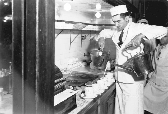 | Everyone Drinks Cafe Au Lait at the French Market, from the WPA Guide to New Orleans. |