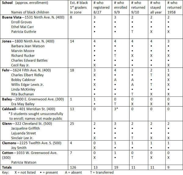 A mile or so from Jones, on Fifth Avenue North, four children crossed the segregation line: two girls, Linda McKinley and Rita Buchanan, and two boys, Charles Elbert Ridley and Willis Edgar Lewis Jr. All four had registered early. A fifth child, Bobby Cabknor, had pre-registered but was not in attendance on opening day. The school census had indicated that eighteen black first graders were living in the Fehr zone.