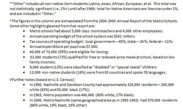 1963: Nashville and Davidson County governments merge, creating one political jurisdiction of 400,000 people (83% white, 17% black) and one unified (though still largely segregated) school system with about 85,000 students (79% white, 22% black, 1% "other").