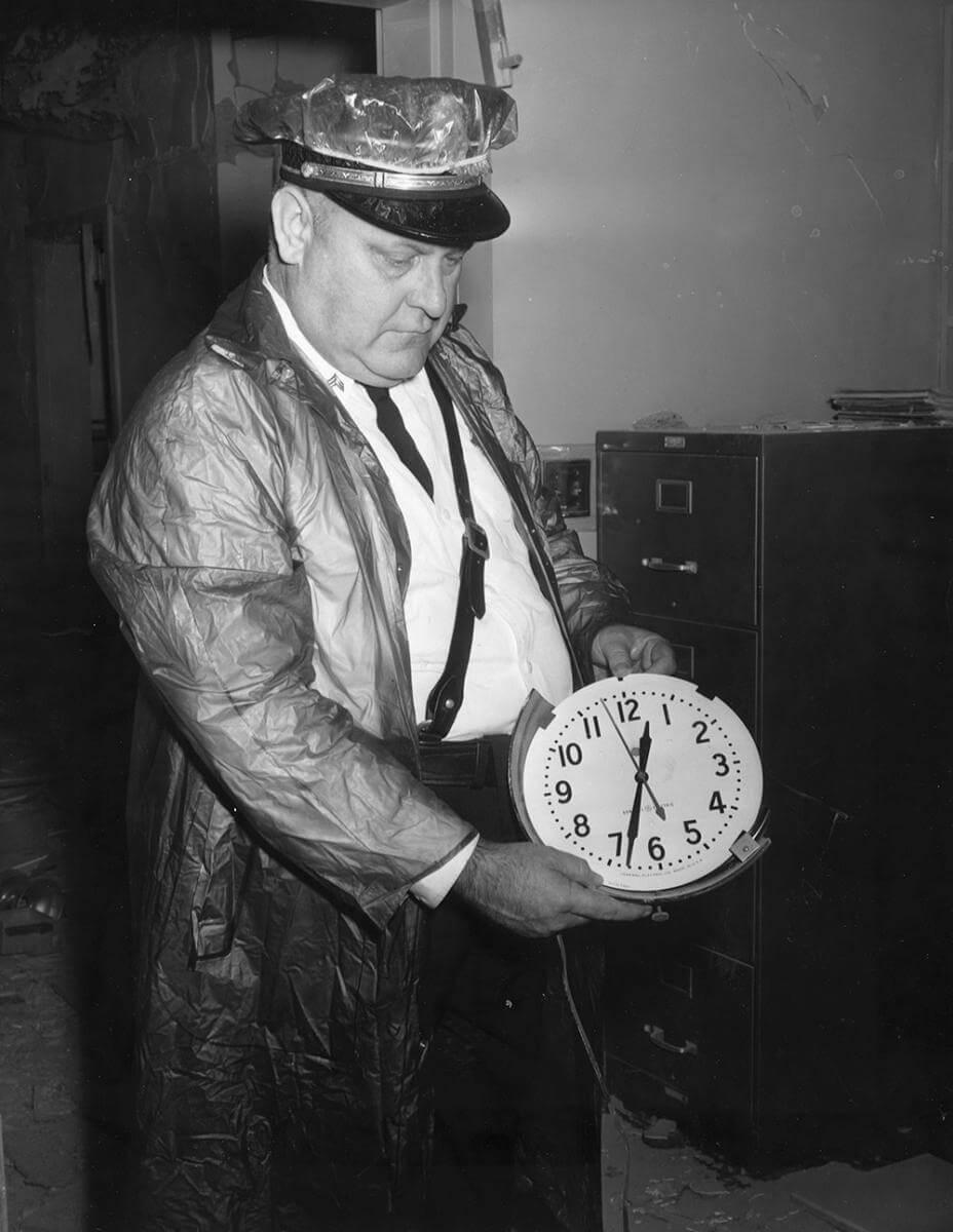A stopped electric clock in the school had recorded the precise time of the blast—12:33. Less than ten minutes after that, two officers who had been on a stakeout to monitor Kasper's movements entered his temporary residence on Scott Avenue, less than a mile from the bombed school. Armed with a warrant that he had sworn out earlier, based on Kasper's Monday activities, Constable Floyd Peek and his partner rousted Kasper out of bed and took him to the downtown police station, where he was charged with disturbing the peace. A night court judge ordered him held without bond.