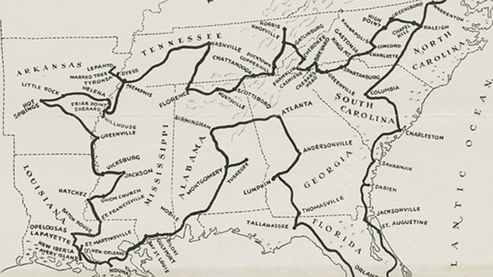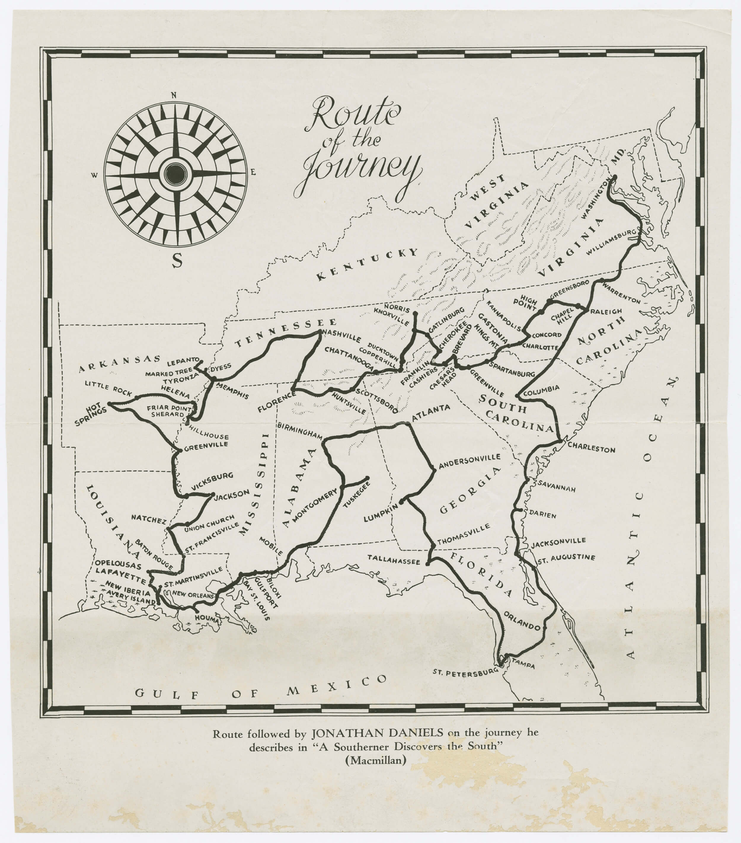 I am planning to leave here shortly after the first of May and follow the main street of the new industrial South from Greensboro to Charlotte, Spartanburg and Greenville; then turn to the right and cut through the Great Smoky Mountains National Park to Knoxville; then via Dayton (of monkey trial fame) to Chattanooga and from Chattanooga by Scottsboro, Alabama, through the Tennessee Valley to Memphis; from Memphis through the Marked Tree area where the tenant farmers union was active and on to Little Rock and Hot Springs; from Hot Springs into Mississippi via Greenville, Vicksburg, Natchez and on to Baton Rouge and New Orleans; from New Orleans via Mobile and Montgomery to Birmingham; from Birmingham to Atlanta; from Atlanta down the west coast of Florida to Key West and up the east coast of Florida to Savannah and then home by Charleston and Wilmington.1Jonathan Daniels to Josephus Daniels, 19 April 1937, in Folder 151 of the Jonathan Daniels Papers #3466, Southern Historical Collection, The Wilson Library, University of North Carolina at Chapel Hill. Hereafter Daniels Papers, SHC.
