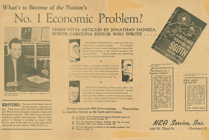 In the fall of 1938, Daniels would capitalize on his authoritative image in three syndicated editorials that purported to answer the question of "What's to Become of the Nation's No. 1 Economic Problem?" He reiterated his faith in New Deal development efforts even as Roosevelt's hopes of extending the New Deal were foundering along with his failed attempt to "purge" the Democratic party of southern conservatives.