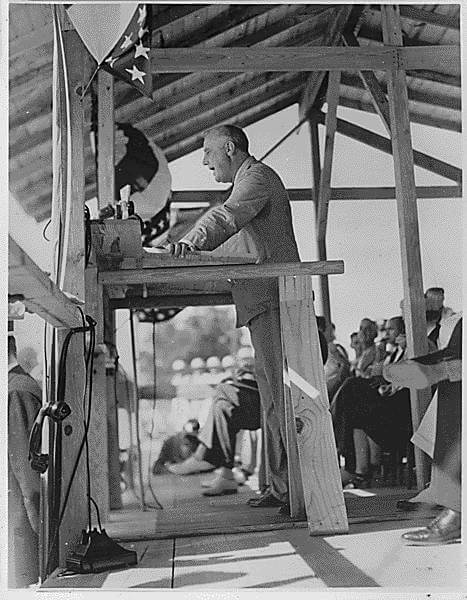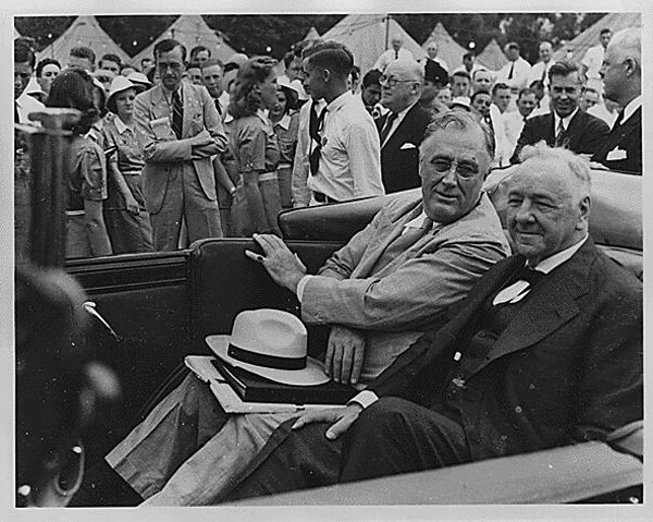 | Franklin D. Roosevelt and Josephus Daniels at 4-H Tent City in West Potomac Park, Washington DC, 14 June 1940. Courtesy of the Franklin D. Roosevelt Presidential Library and Museum. |
