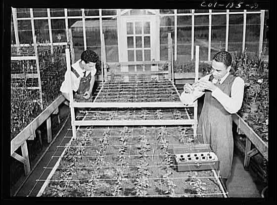 | Arthur Rothstein, students in the greenhouse, Tuskegee Institute, Alabama, 1942. Library of Congress, Prints and Photographs Division, FSA-OWI Collection, LC-USW3- 000185-D. Daniels chose not to describe his visit to Tuskegee in A Southerner Discovers the South, though he did recount what he learned there about racial violence in nearby Lowndes County. |