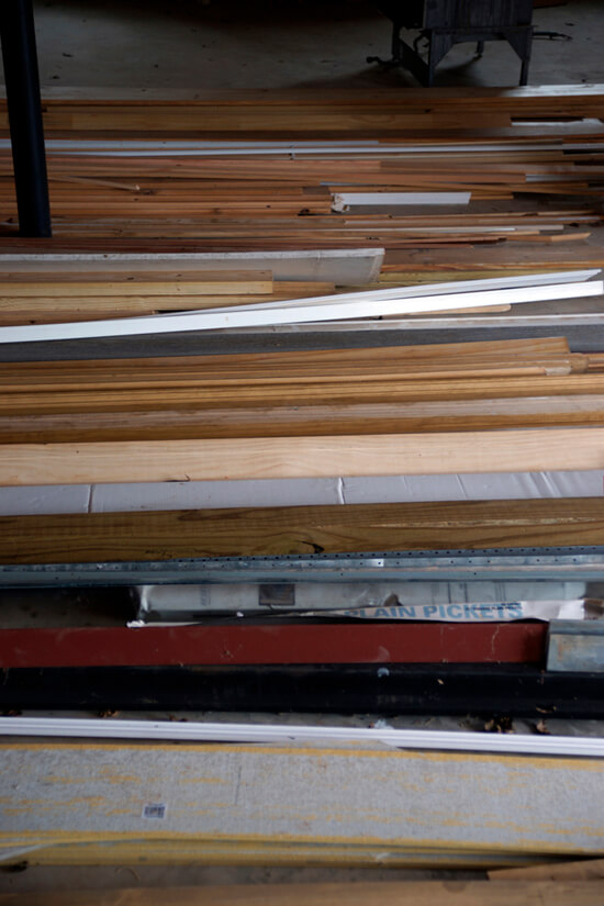 | (top left) Connections; (top middle) Decommissioned flooring, moulding, railing, siding, and plain pickets; (top right) Abandoned frame for a concrete slab marks a futile floor plan; (bottom left) Prior claims of ownership and enclosure; (bottom right) In a far corner of a failing subdivision, a cul-de-sac becomes a wildlife refuge. |