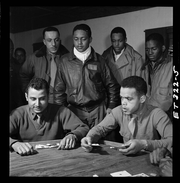 Toni Frissell, Tuskegee airmen Woodrow W. Crockett and Edward C. Gleed, Ramitelli, Italy, March 1945. Courtesy of the Library of Congress.   Toni Frissell, Photograph of several Tuskegee airmen attending a briefing in Ramitelli, Italy, March 1945. Courtesy of the Library of Congress.   Toni Frissell, Tuskegee airmen playing cards in the officers' club in the evening, Ramitelli, Italy, 1945. Courtesy of the Library of Congress.