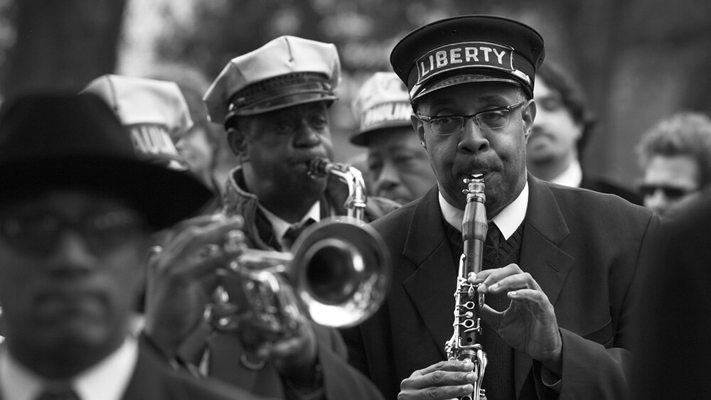 Beyond the recovery and revaluation of artists, the question was raised whether New Orleans jazz as a whole would again be heard regularly in the recently submerged city. Traditional jazz emerged at the end of the nineteenth century—a period of huge repression for people of color. It was a brutal social transition for Creoles and African Americans—who were jazz’s primary early creators and players—as the hope of post–Civil War Reconstruction faded into the Jim Crow era. Writer Ralph Ellison later suggested that jazz’s birth and growth was a "freedom statement," "Constitution," and "Bill of Rights" for African Americans. In New Orleans, Creoles, African Americans, and some Euro-Americans (especially Italians) have long played the music.11Personal communication, Robert O’Meally, 2004. Early jazz had mostly European instrumentation (excepting the African-descended banjo and in some sense the use of drums even in manufactured kit configurations), a musical and social connection to US military and Catholic saints’ day parades, and African/Caribbean/American-inflected performance practices, rhythms, scales, harmonies, and associated street dance forms. Early New Orleans jazz has long been distinguished more by style (heterophony and group improvisation) rather than repertoire—the latter may include parlor and popular songs, hymns, blues, and marches.