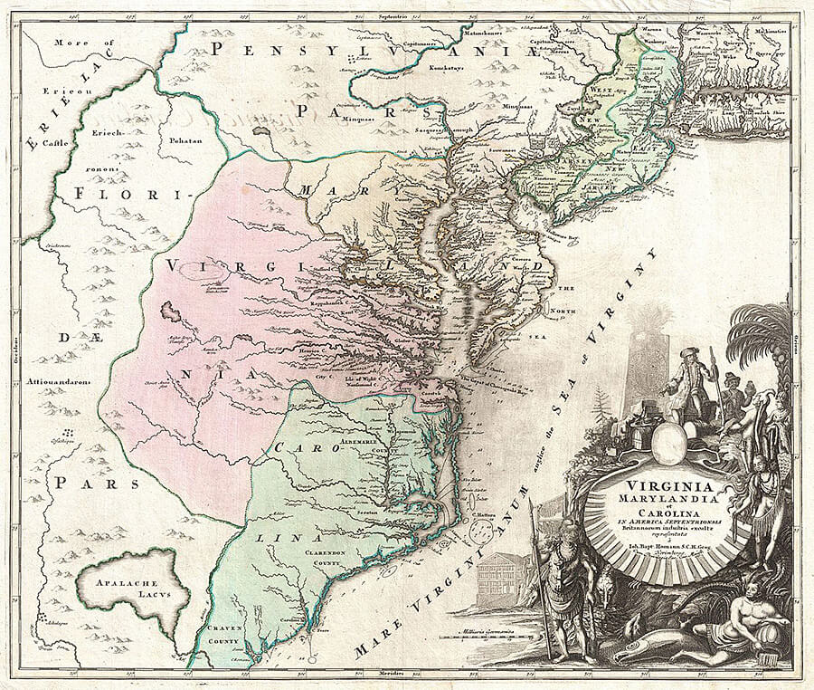 Johann Homann, "Virginia Marylandia et Carolina in America Septentrionali Britannorum industria excultae . . .," 1715. Via Wikimedia Commons.