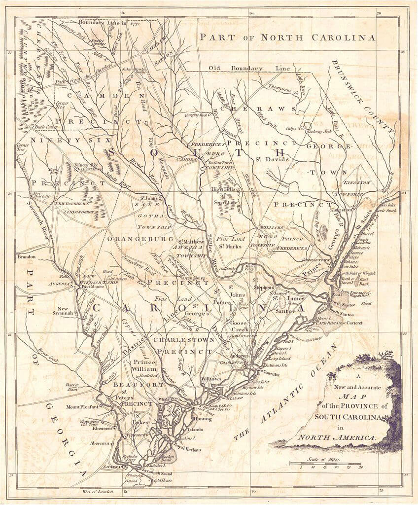This map of the state of South Carolina in 1779 illustrates the border which was drawn between the colonies of North Carolina and South Carolina in 1772—the same border that present-day researchers sought to recreate aided by GPS technology. The border between the two states was drawn significantly farther to the north (beginning on the coast at Cape Fear) than the colonial border of 1746 represented above in which North Carolina's southern border followed the Savannah River.
