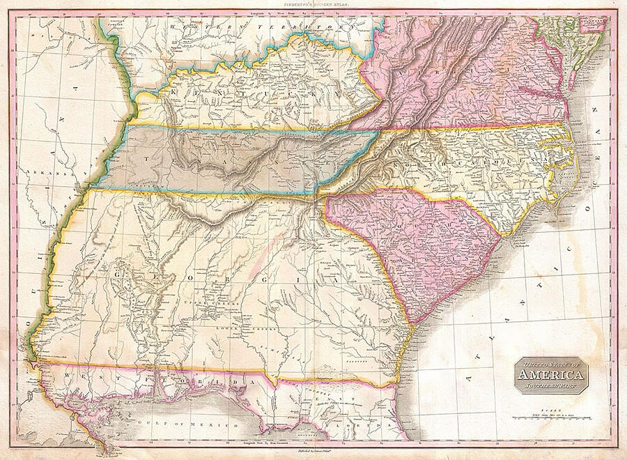 John Pinkerton, "United States of America Southern Part," 1818. From Pinkerton, J., A Modern Atlas, from the Latest and Best Authorities, Exhibiting the Various Divisions of the World with its chief Empires, Kingdoms, and States; in Sixty Maps, carefully reduced from the Larges and Most Authentic Sources (Philadelphia: Thomas Dobson Edition, 1818). Via Wikimedia Commons.