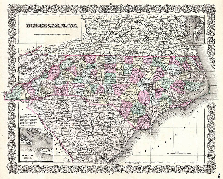 Joseph Hutchins Colton, "North Carolina," 1855. From Colton, G. W., Colton's Atlas of the World Illustrating Physical and Political Geography, vol. 1 (New York, 1855). Via Wikimedia Commons.