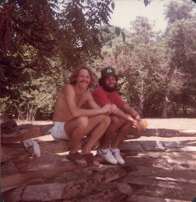 | David Romtvedt and John Lane (in hat) as they drove cross country, Springfield, Illinois, 1978. |