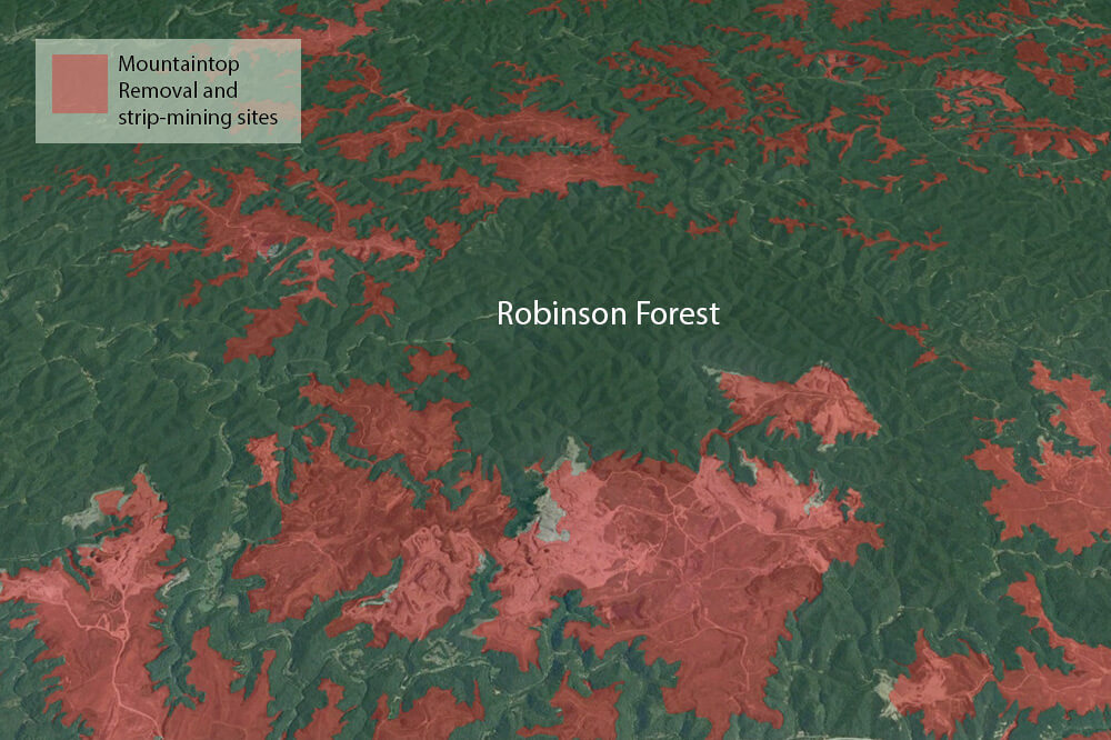 Map showing Robinson Forest and surrounding sites of mountaintop removal and strip-mining, Robinson Forest, Kentucky, 2012. Map by Southern Spaces, created with Google Earth mountaintop removal "Extent of Mining Survey" layer courtesy of iLoveMountains.org.