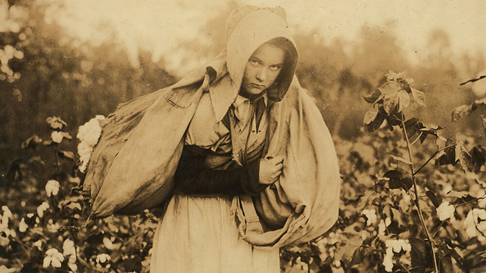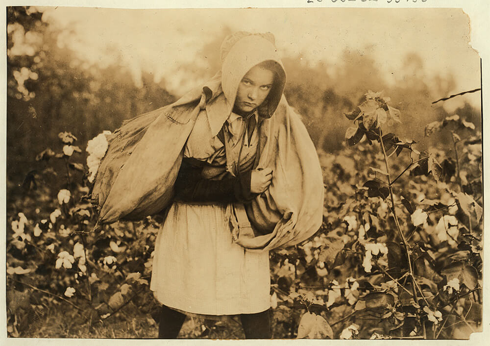 Figure 1. "Cleo Campbell, 9 years, picks 75 to 100 pounds of cotton a day. Expects to start school soon. Said: 'I'd ruther go to school and then I wouldn’t have ter work.' Father said she and her sister begin about 6 A.M. and work until 6 or 7 P.M. with 1 hours off at noon."